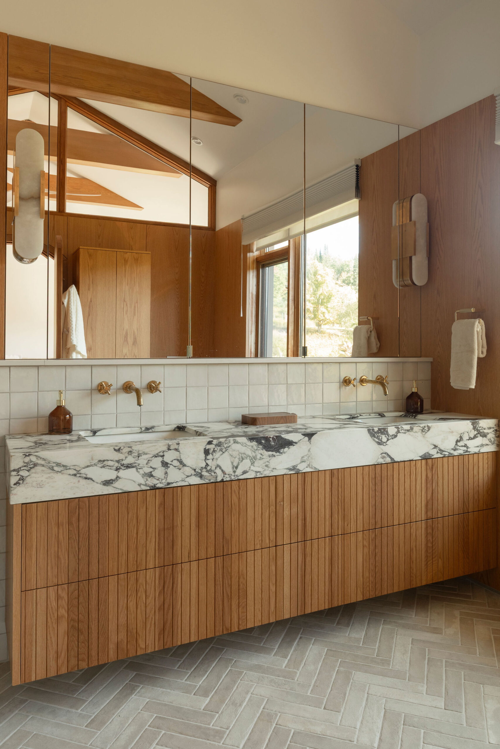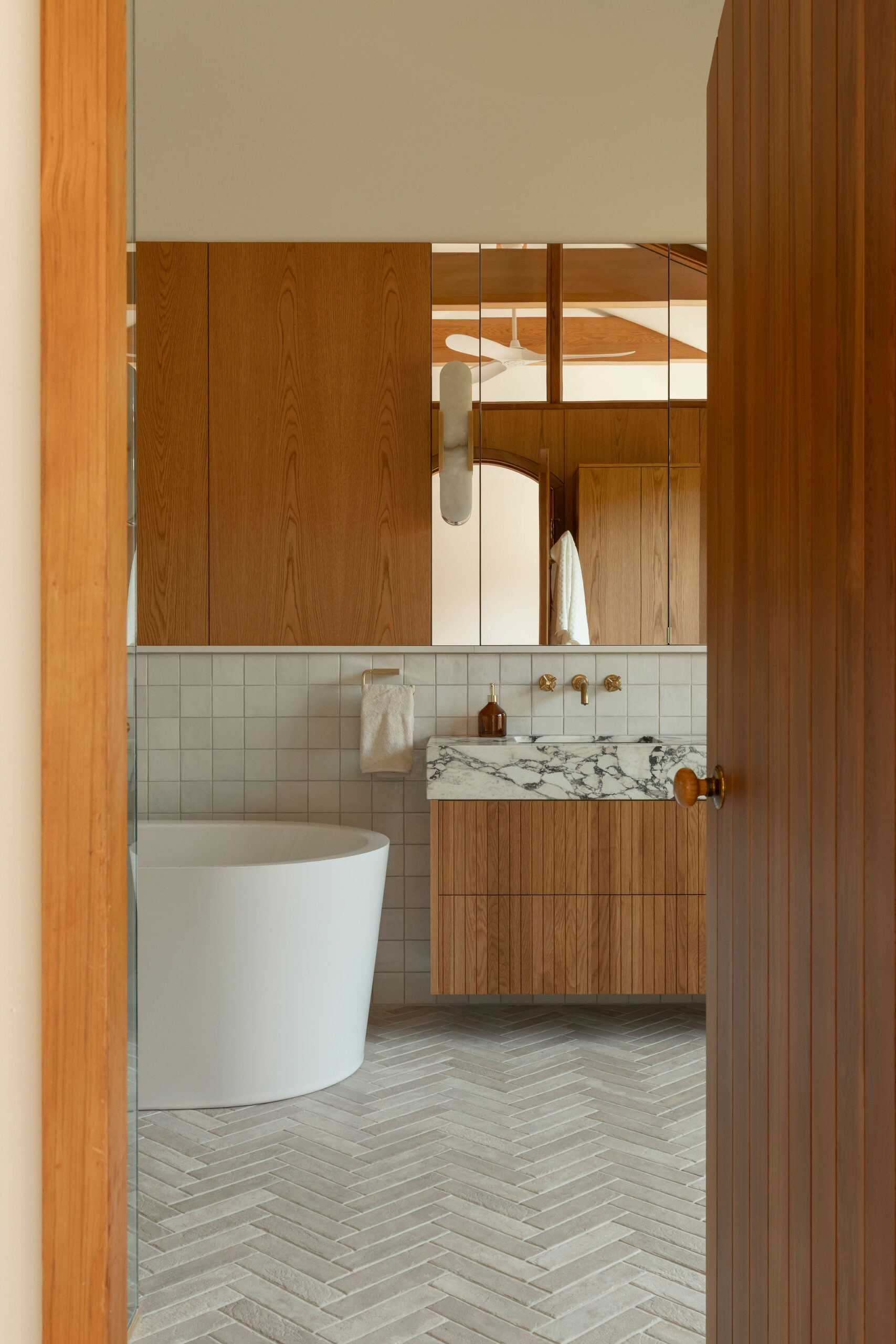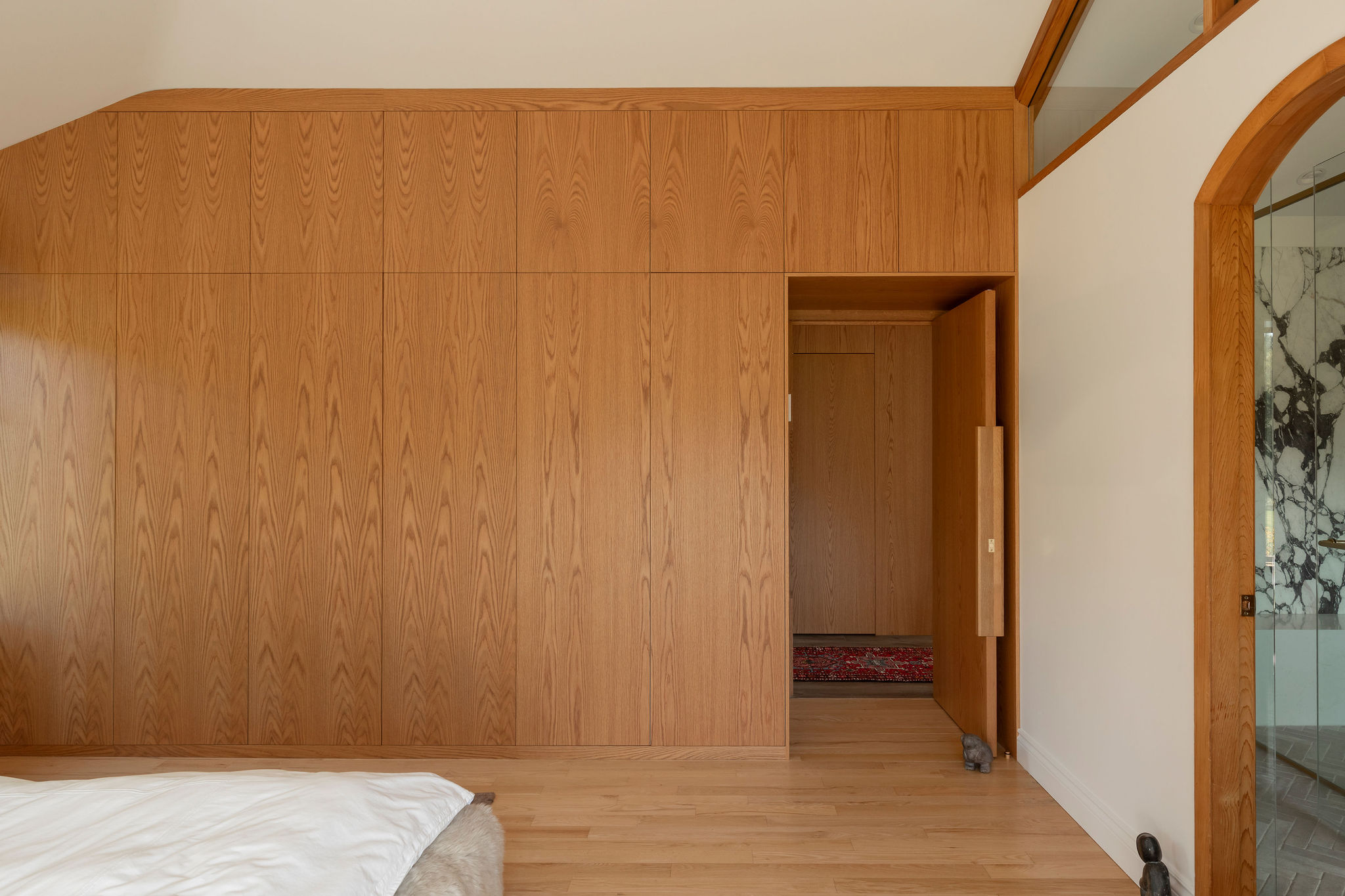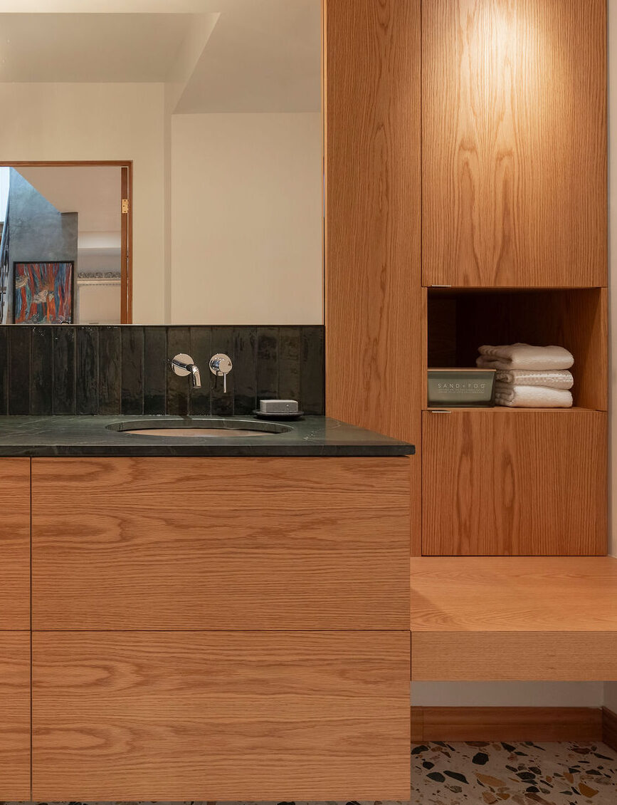 The spaces are enveloped by architectural woodwork that discreetly conceals storage and passageways with perfectly controlled restraint. In the bathroom, the warmth of the wood complements the sculptural marble and brass accents, creating a refined, almost jewel-like contrast.