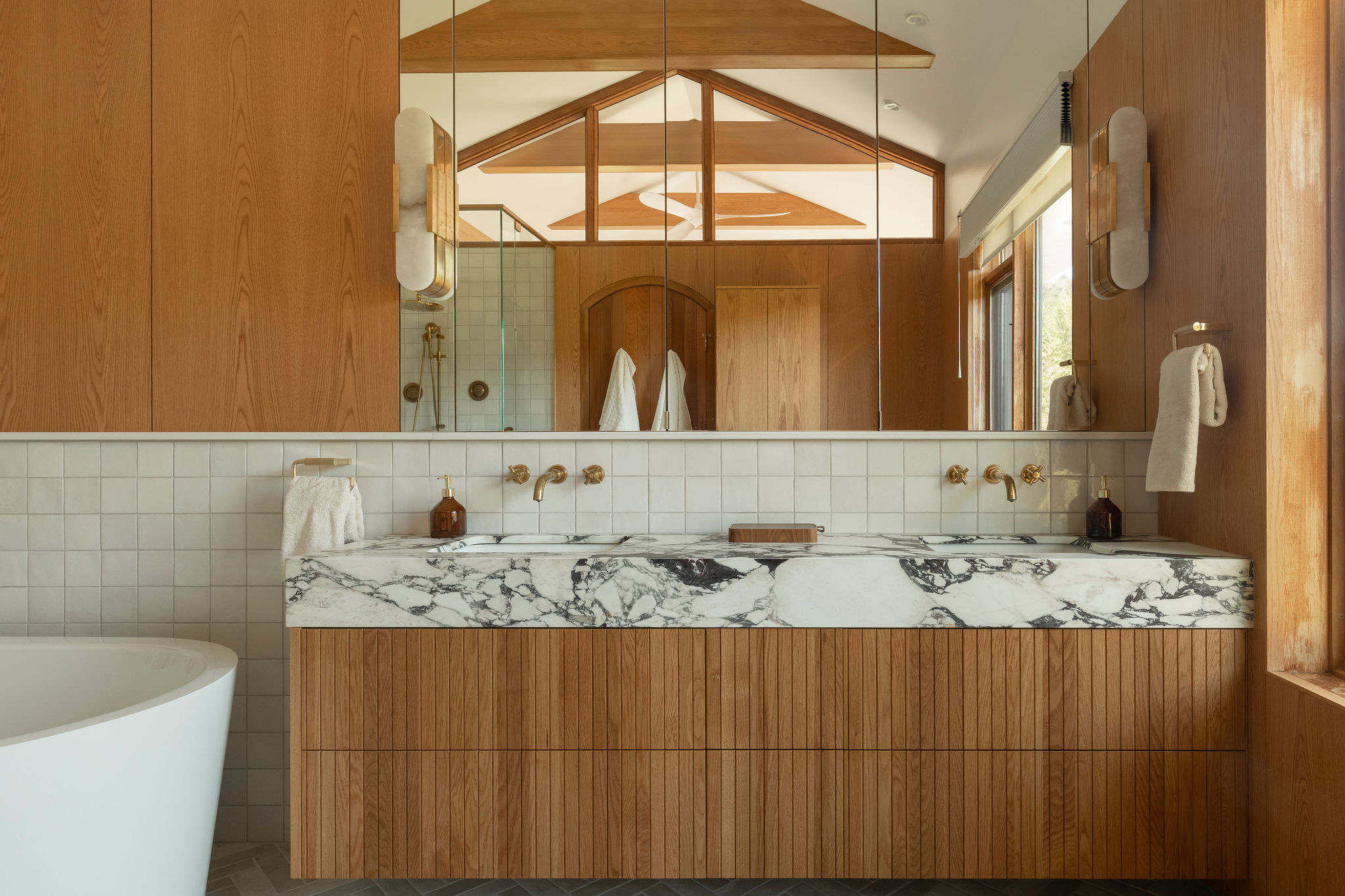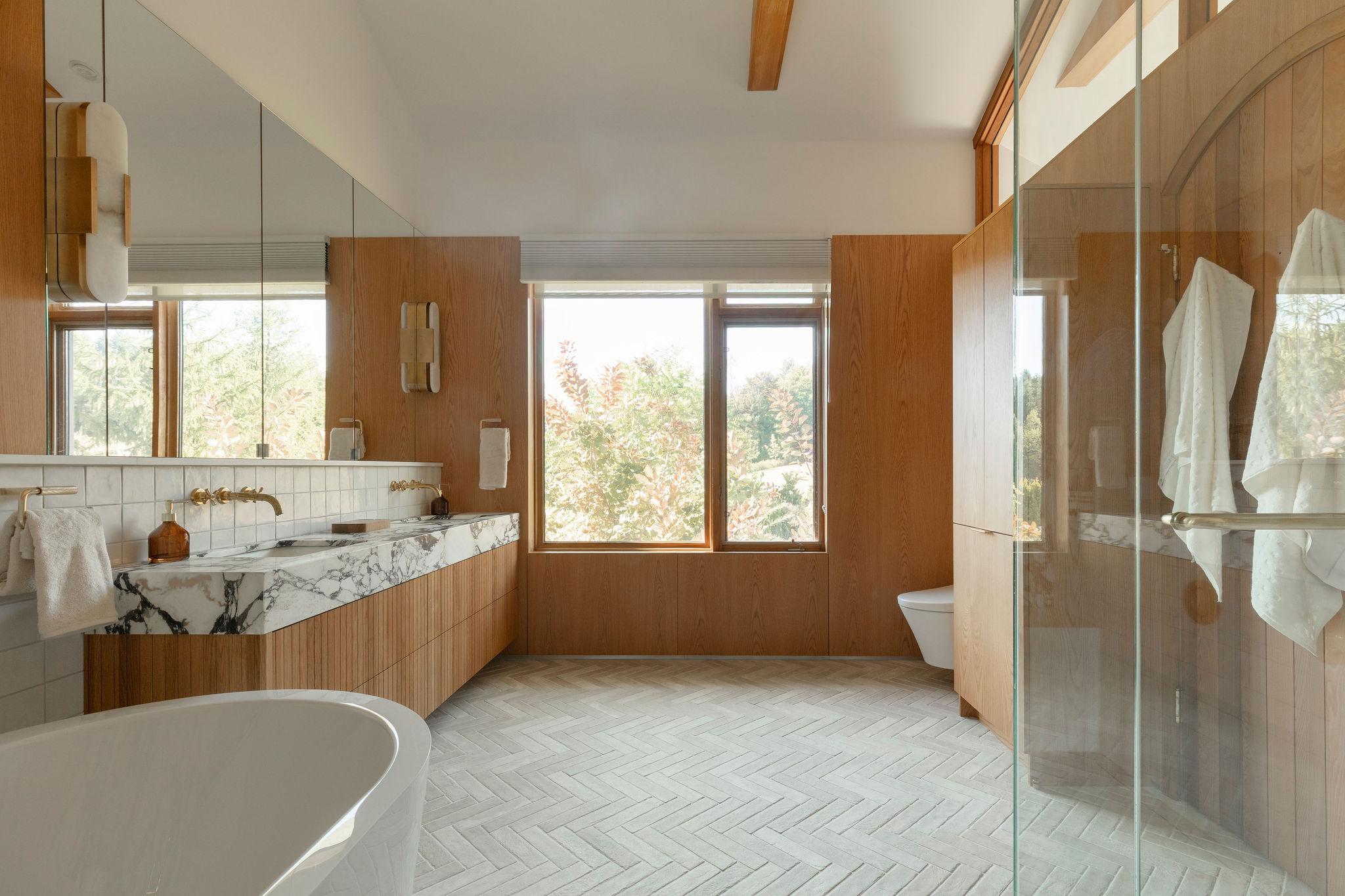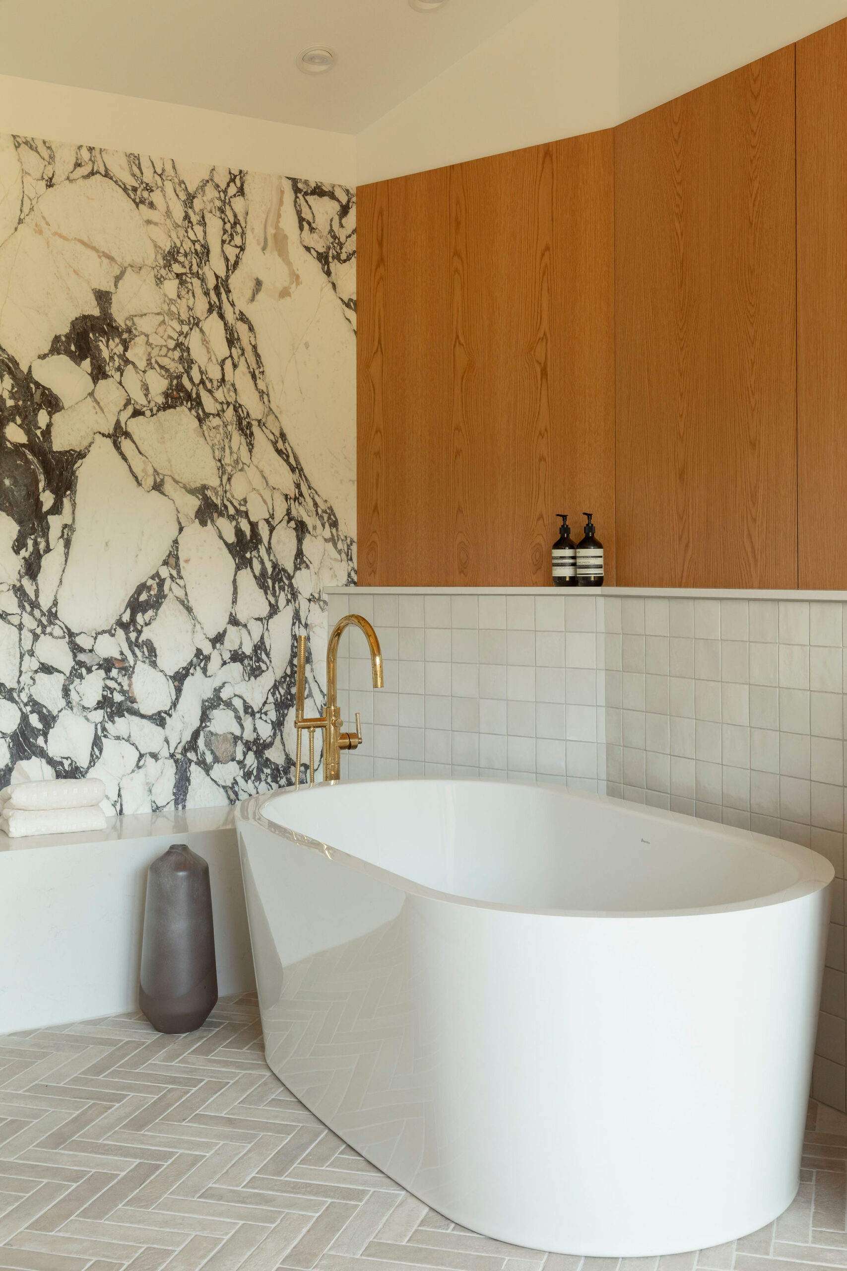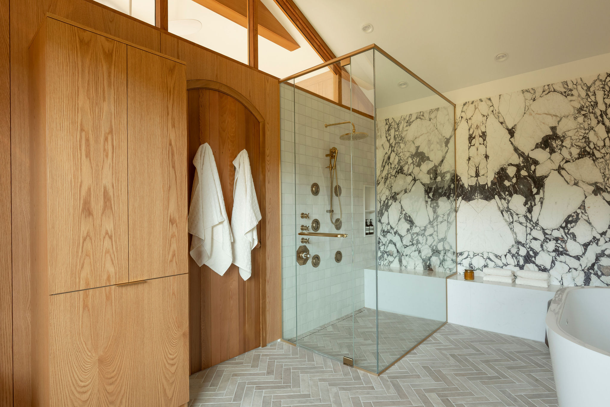 The spaces are enveloped by architectural woodwork that discreetly conceals storage and passageways with perfectly controlled restraint. In the bathroom, the warmth of the wood complements the sculptural marble and brass accents, creating a refined, almost jewel-like contrast.