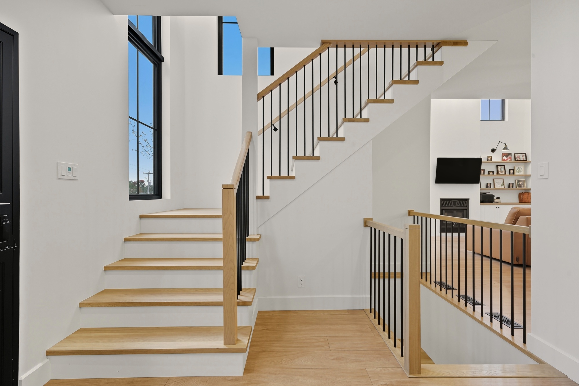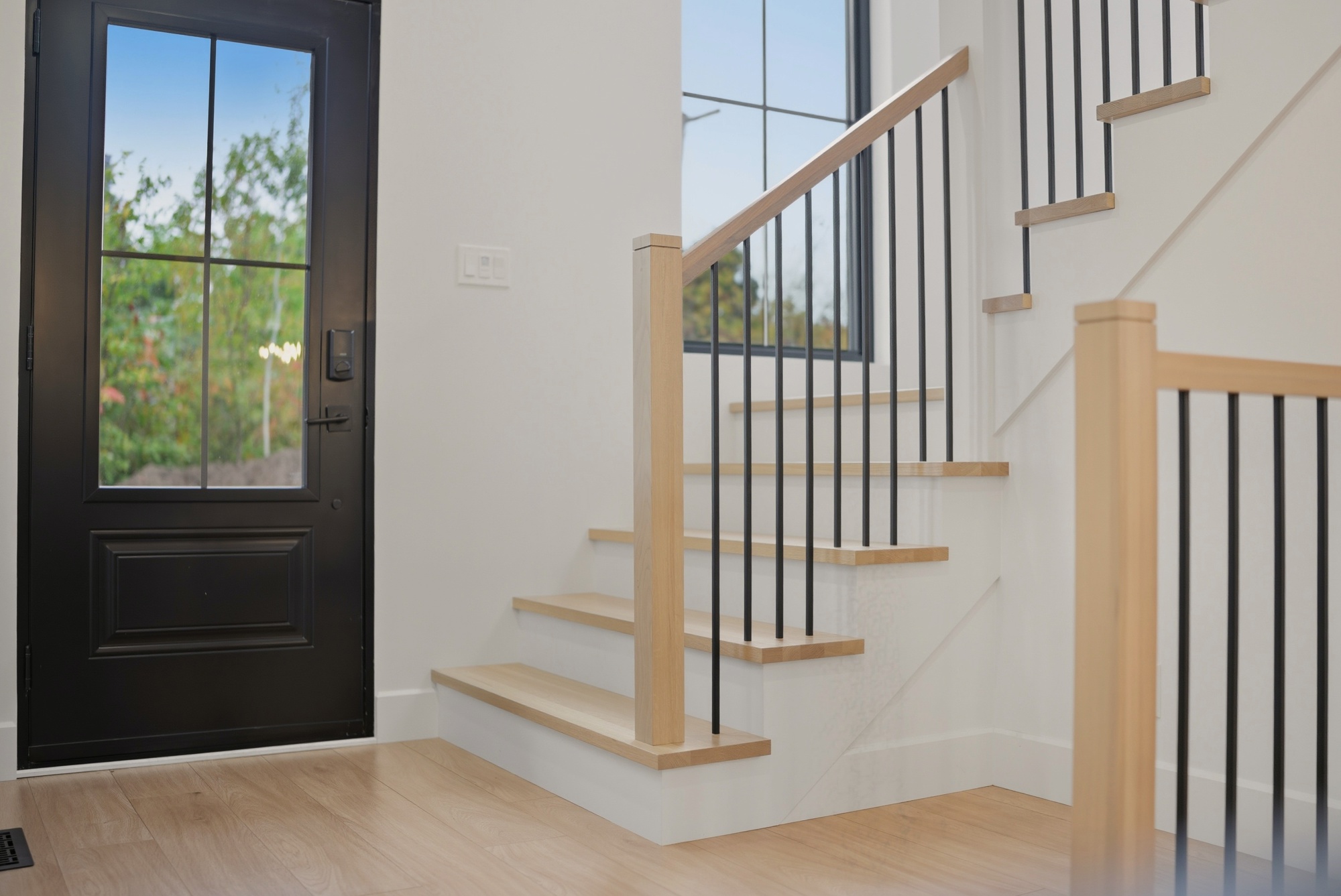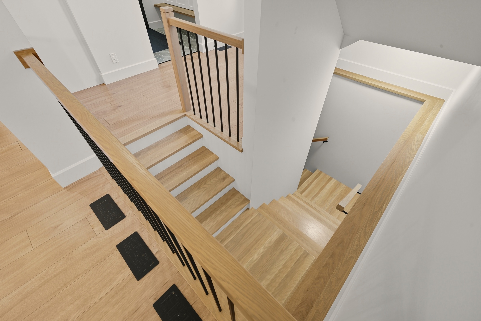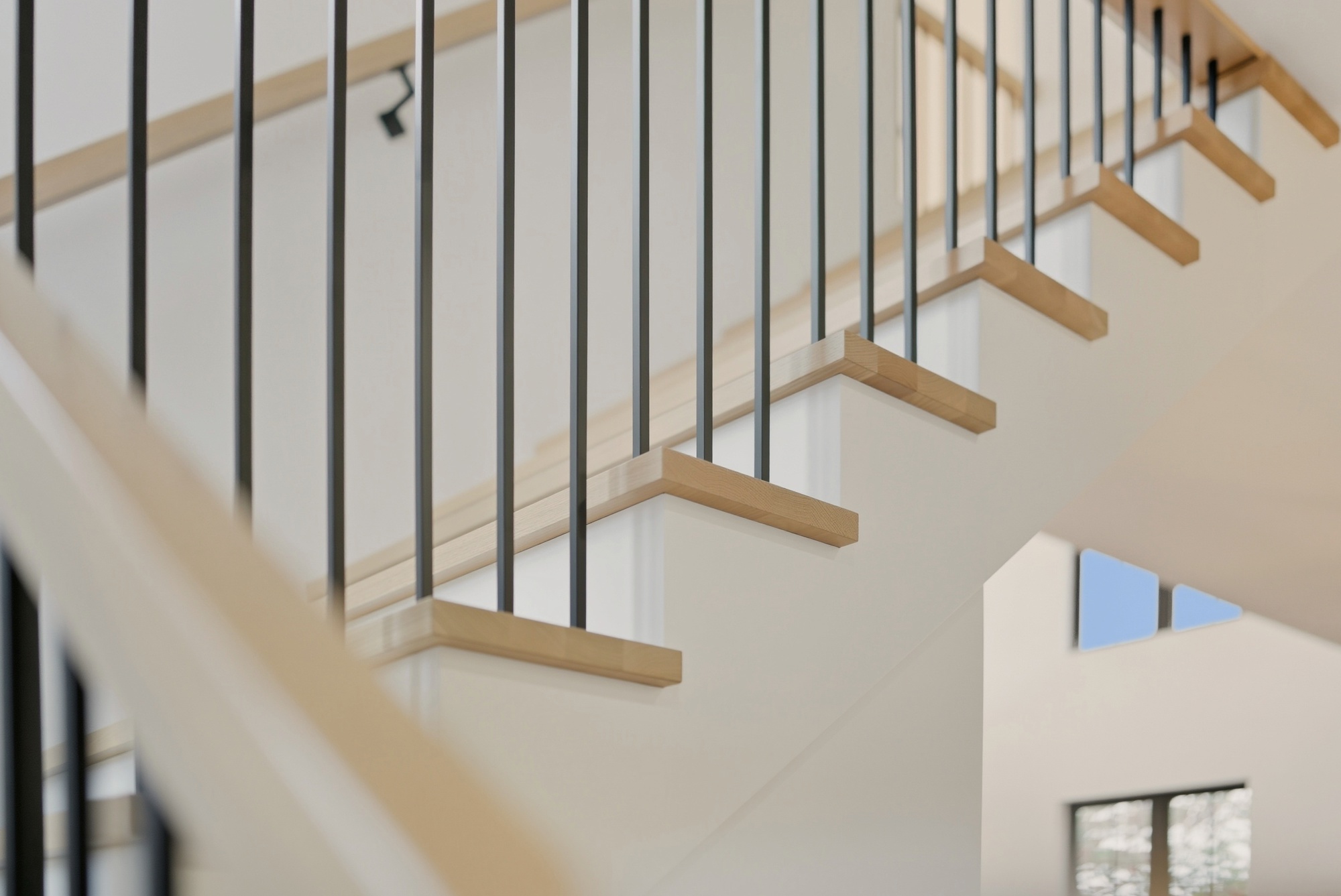 Conceived as a piece of architecture in its own right, this staircase blends the warmth of white oak with the purity of white-painted maple, creating a subtle and timeless contrast. Every line is meticulously drawn, every joint precise: the 45-degree finish at the riser and stringer provides a perfectly clean transition, without any visual break.