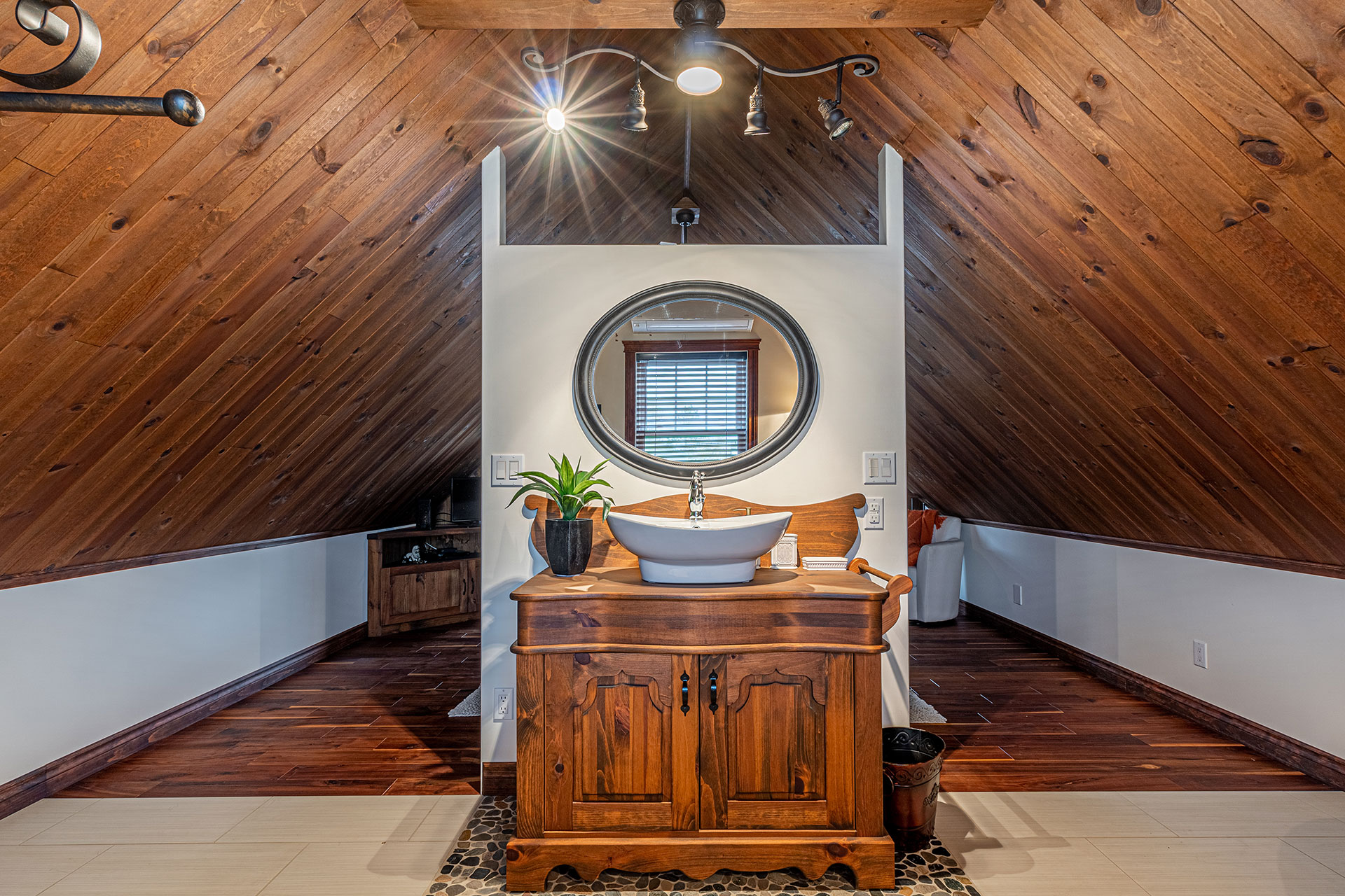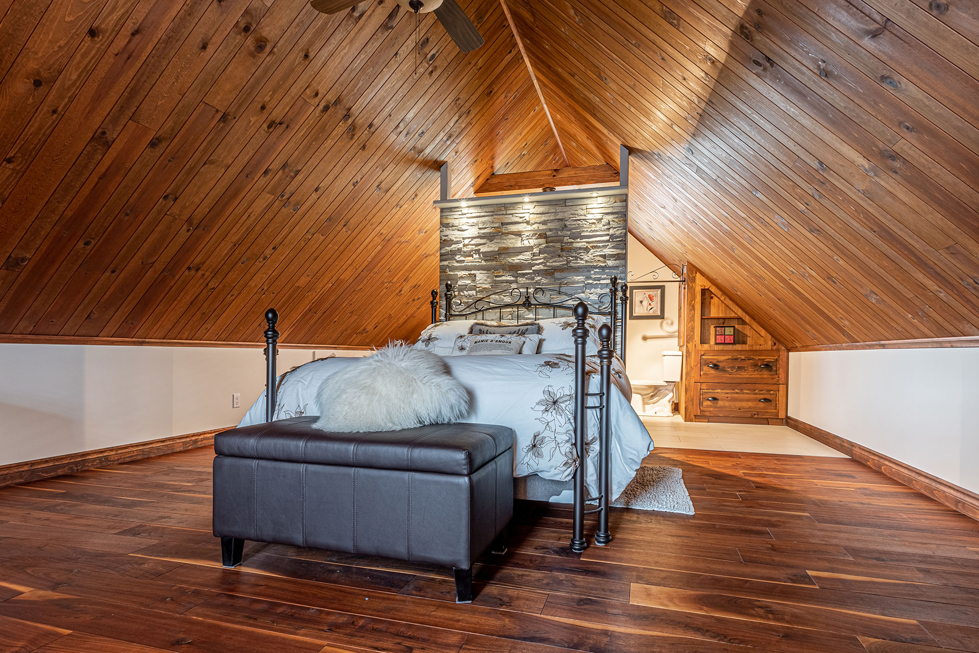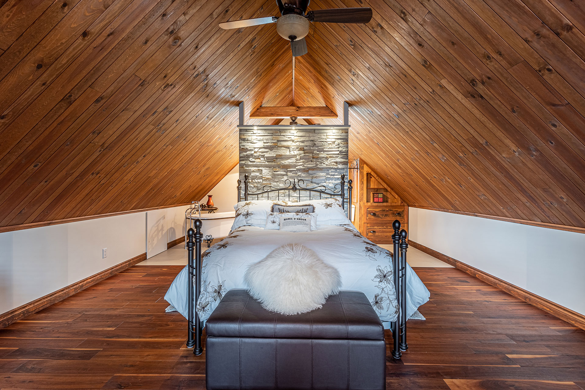 Modular flooring, ceiling, and storage for the attic bedroom with ensuite bathroom.