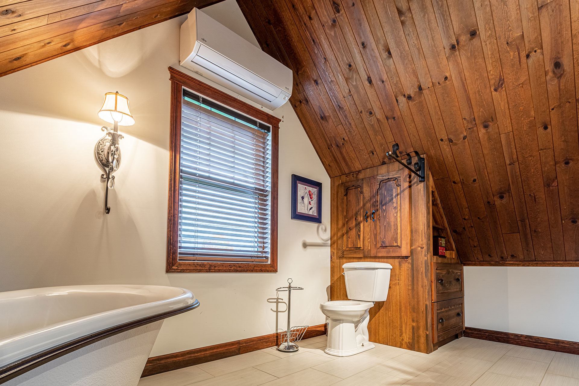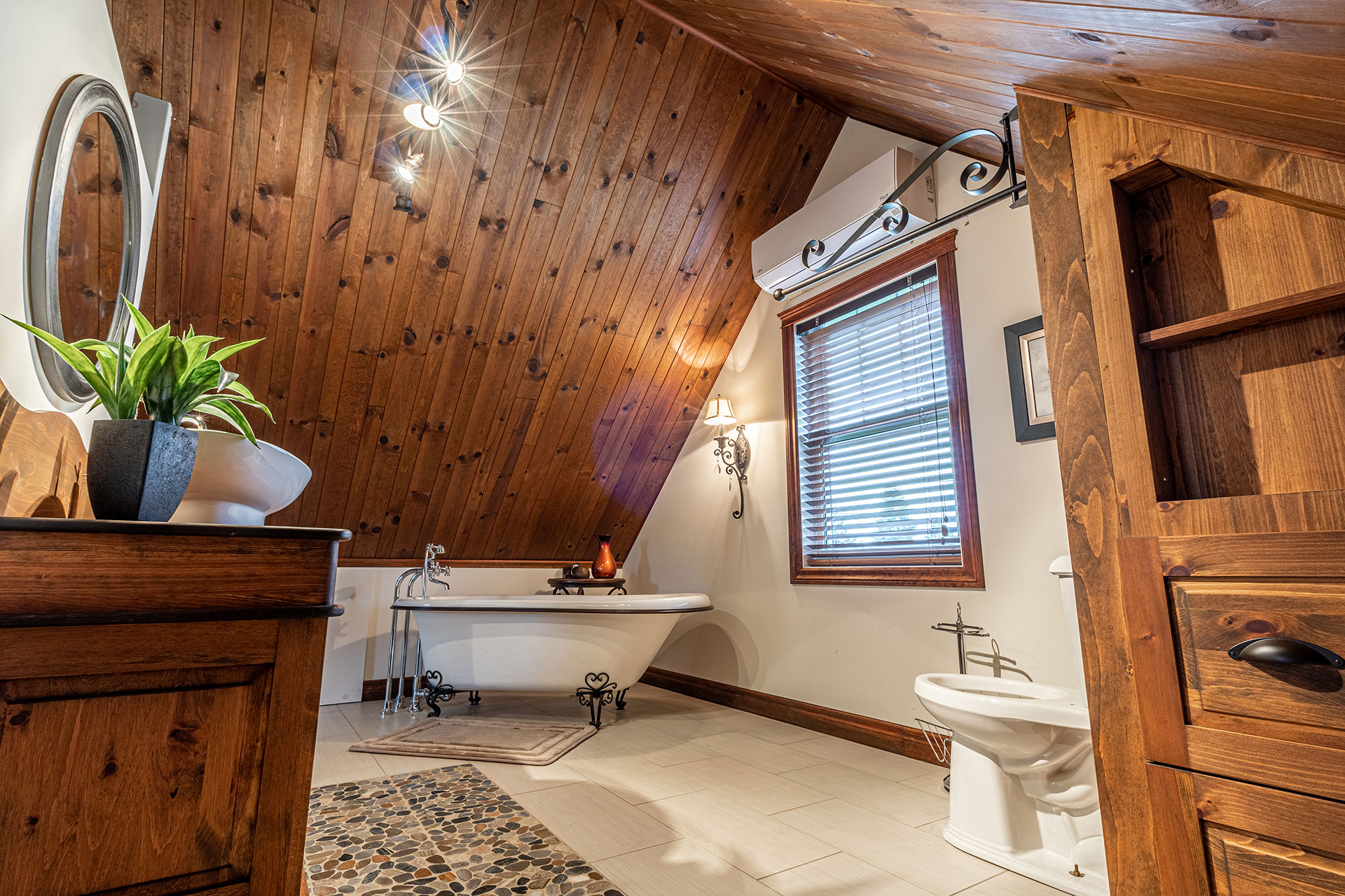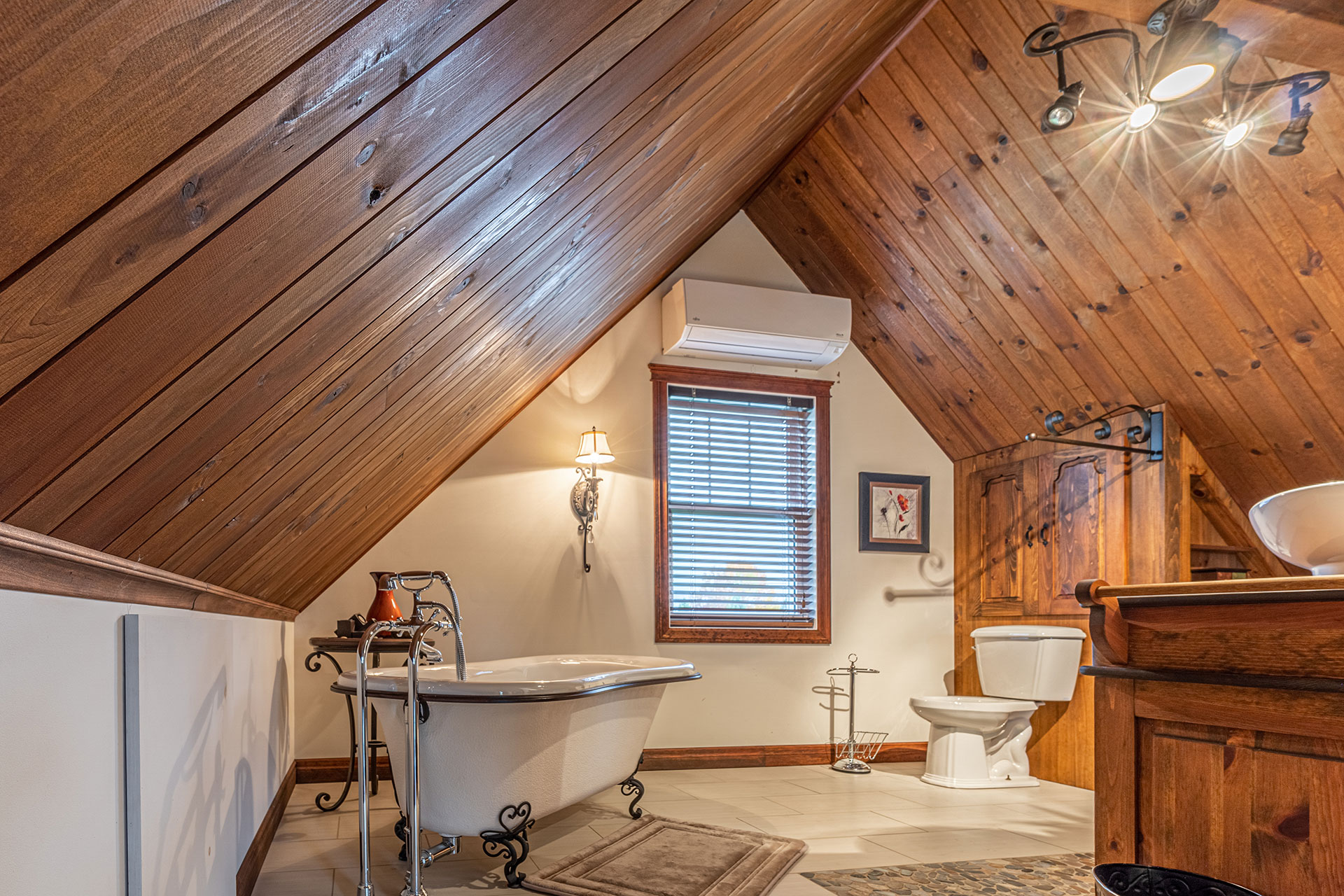 Modular flooring, ceiling, and storage for the attic bedroom with ensuite bathroom.