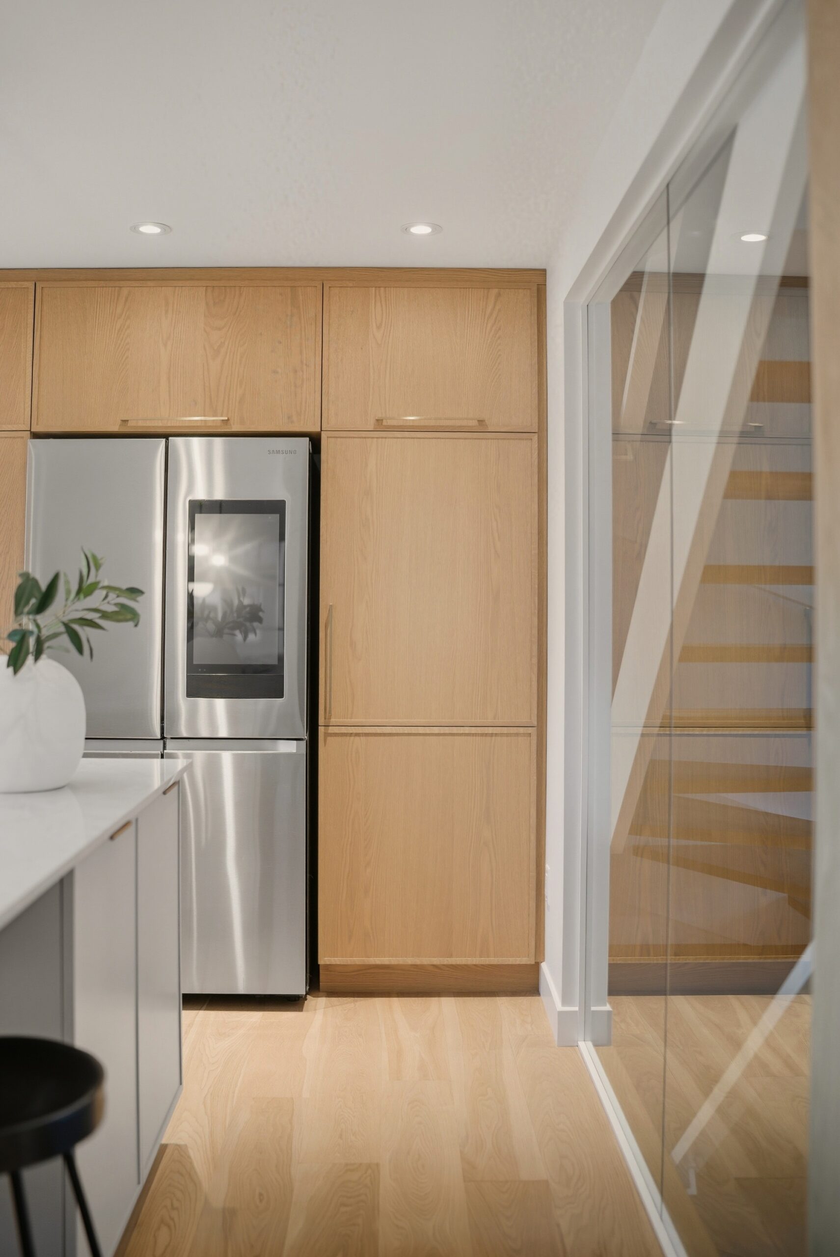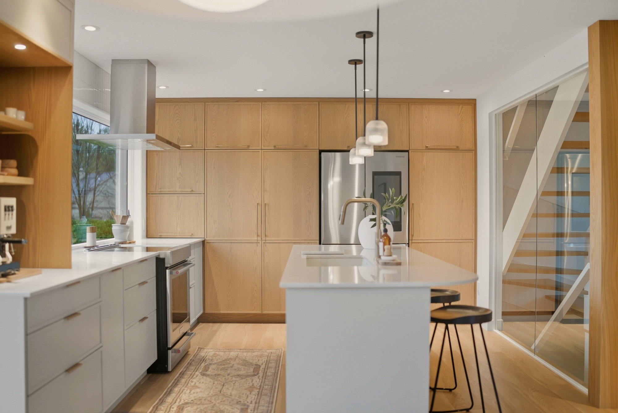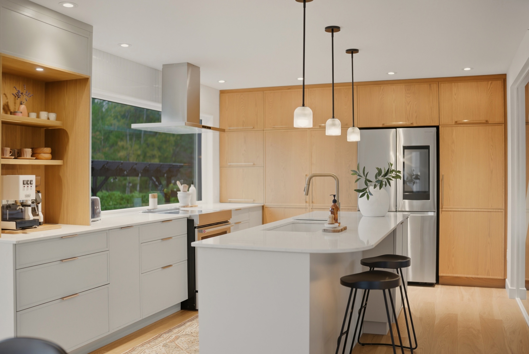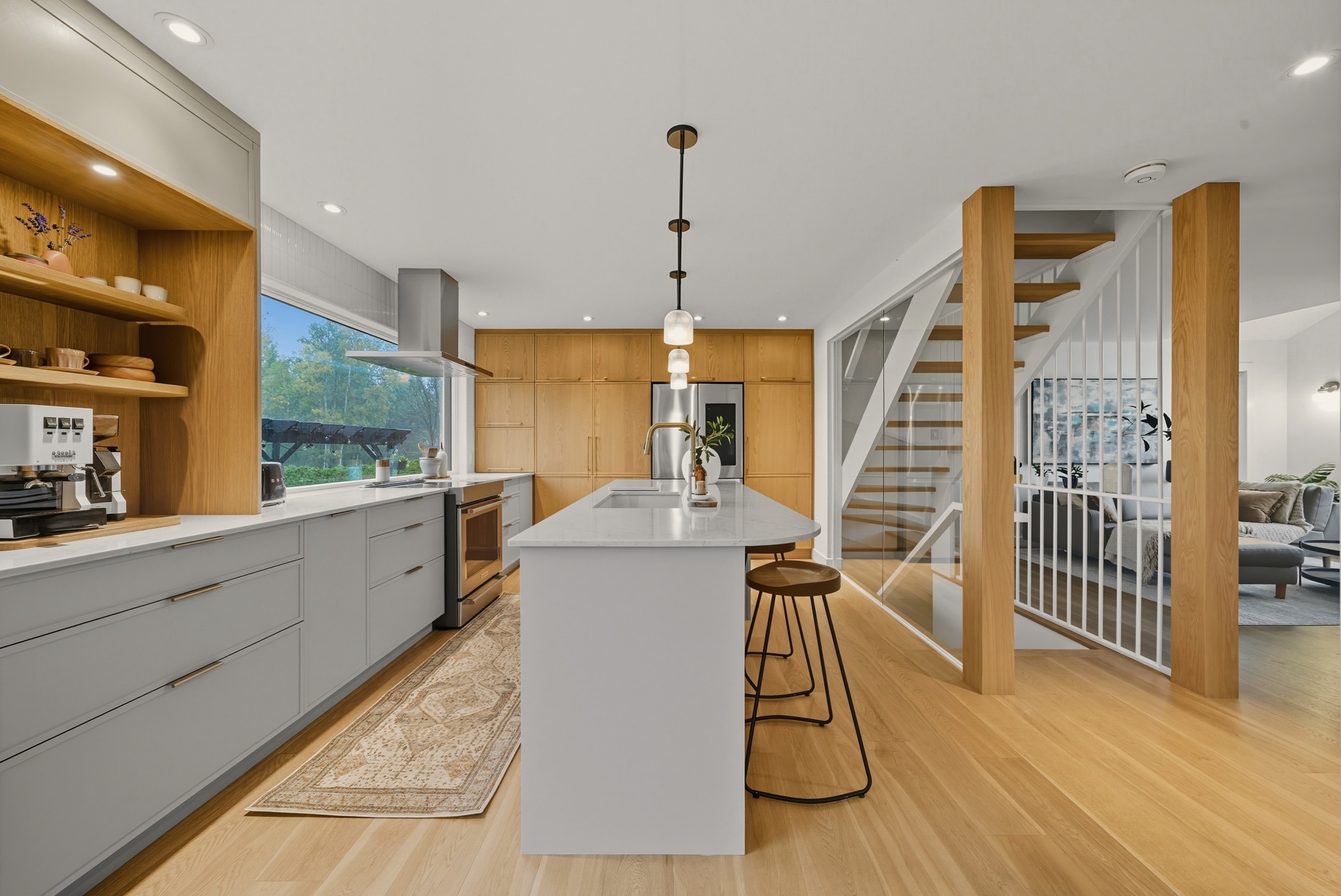 En contraste, le chêne blanc naturel vient réchauffer la composition avec sa texture vivante et son grain délicat, ancrant l’espace dans une matière authentique et intemporelle. Les volumes pleine hauteur structurent la pièce avec précision, tandis que le coin café, intégré comme une alcôve, crée un moment intime — un luxe discret, au quotidien.