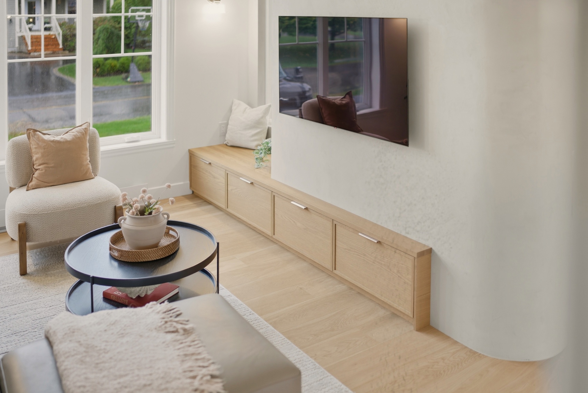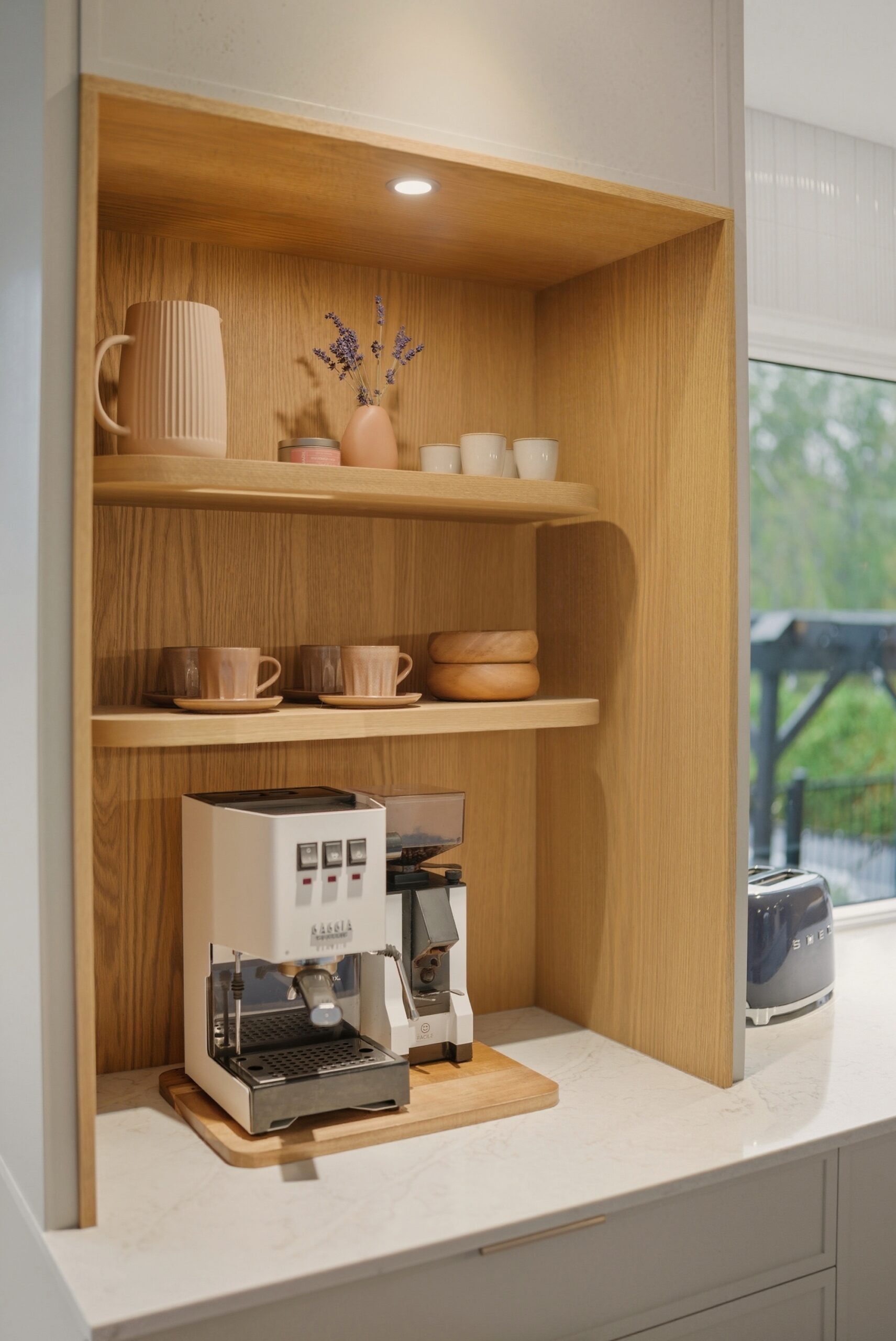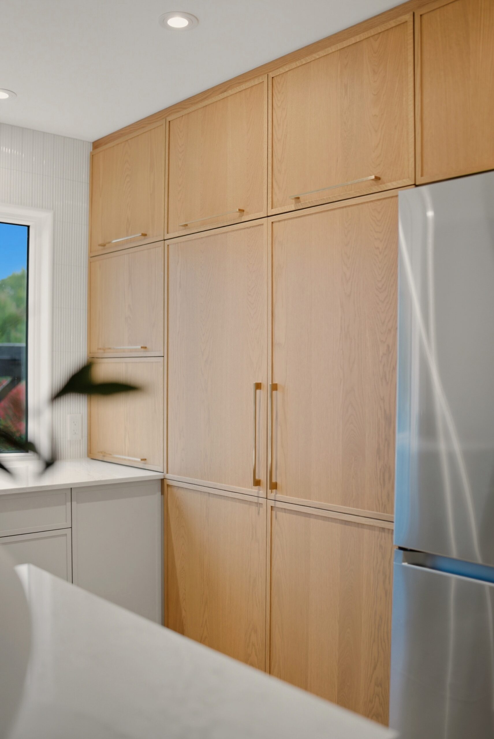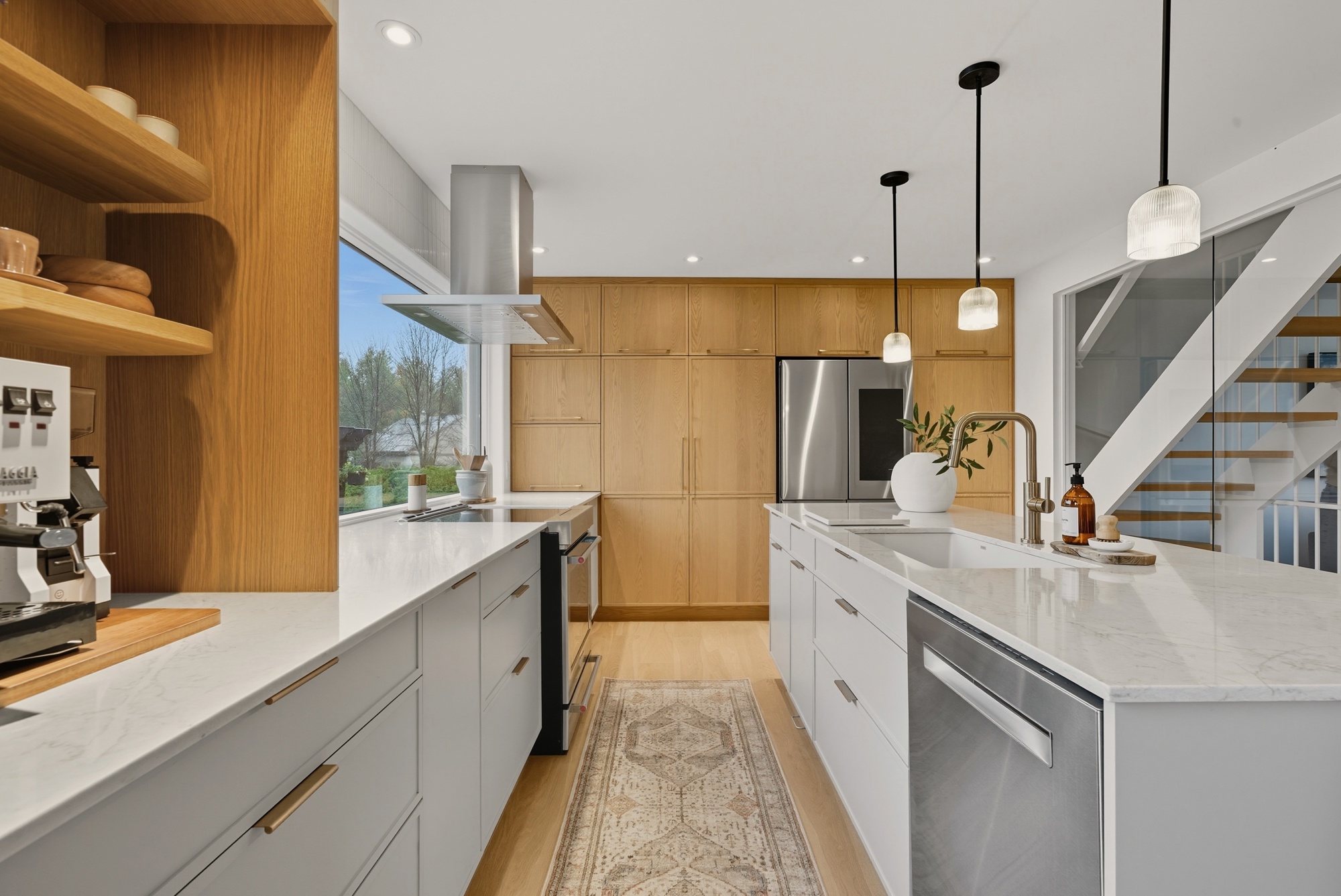 En contraste, le chêne blanc naturel vient réchauffer la composition avec sa texture vivante et son grain délicat, ancrant l’espace dans une matière authentique et intemporelle. Les volumes pleine hauteur structurent la pièce avec précision, tandis que le coin café, intégré comme une alcôve, crée un moment intime — un luxe discret, au quotidien.