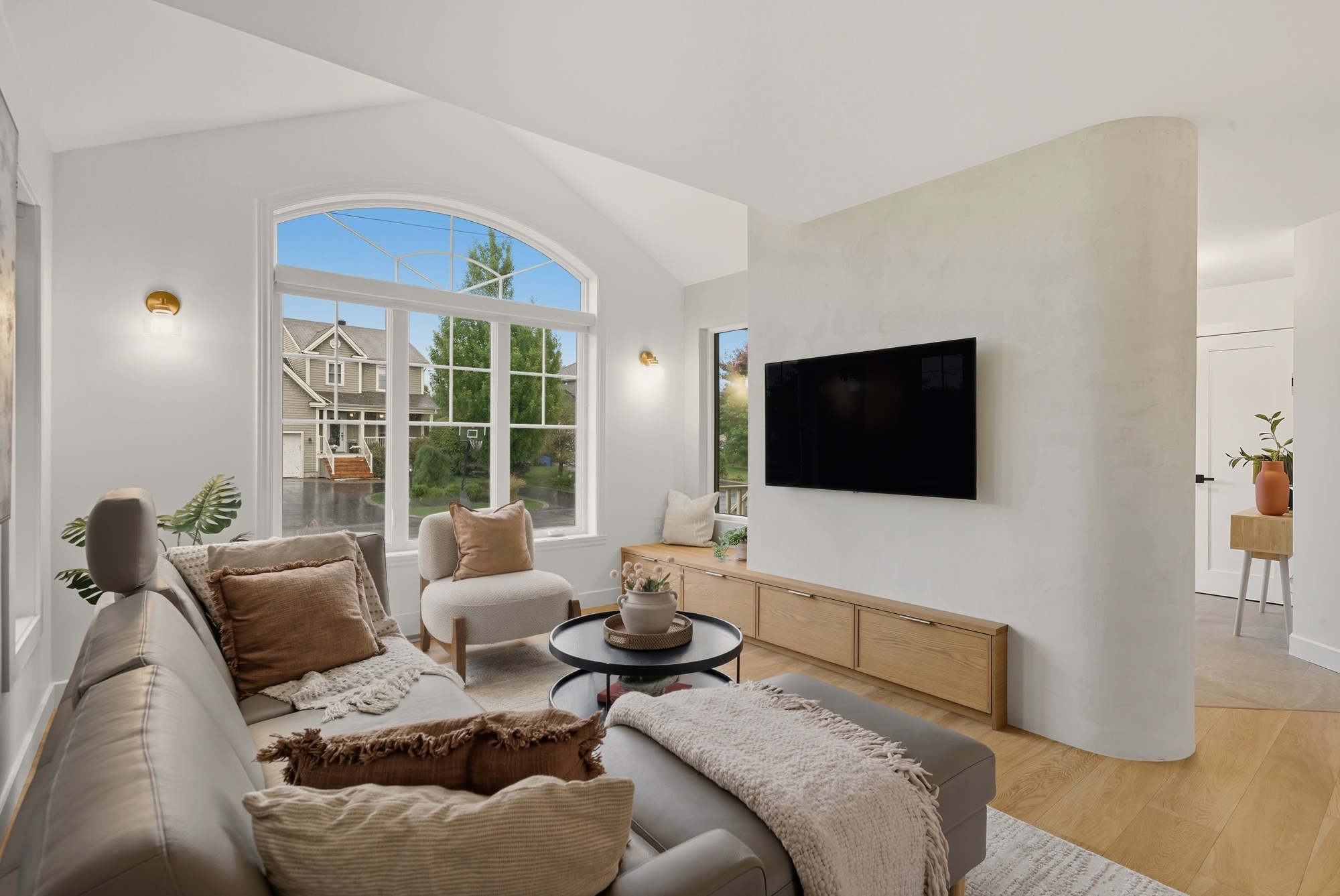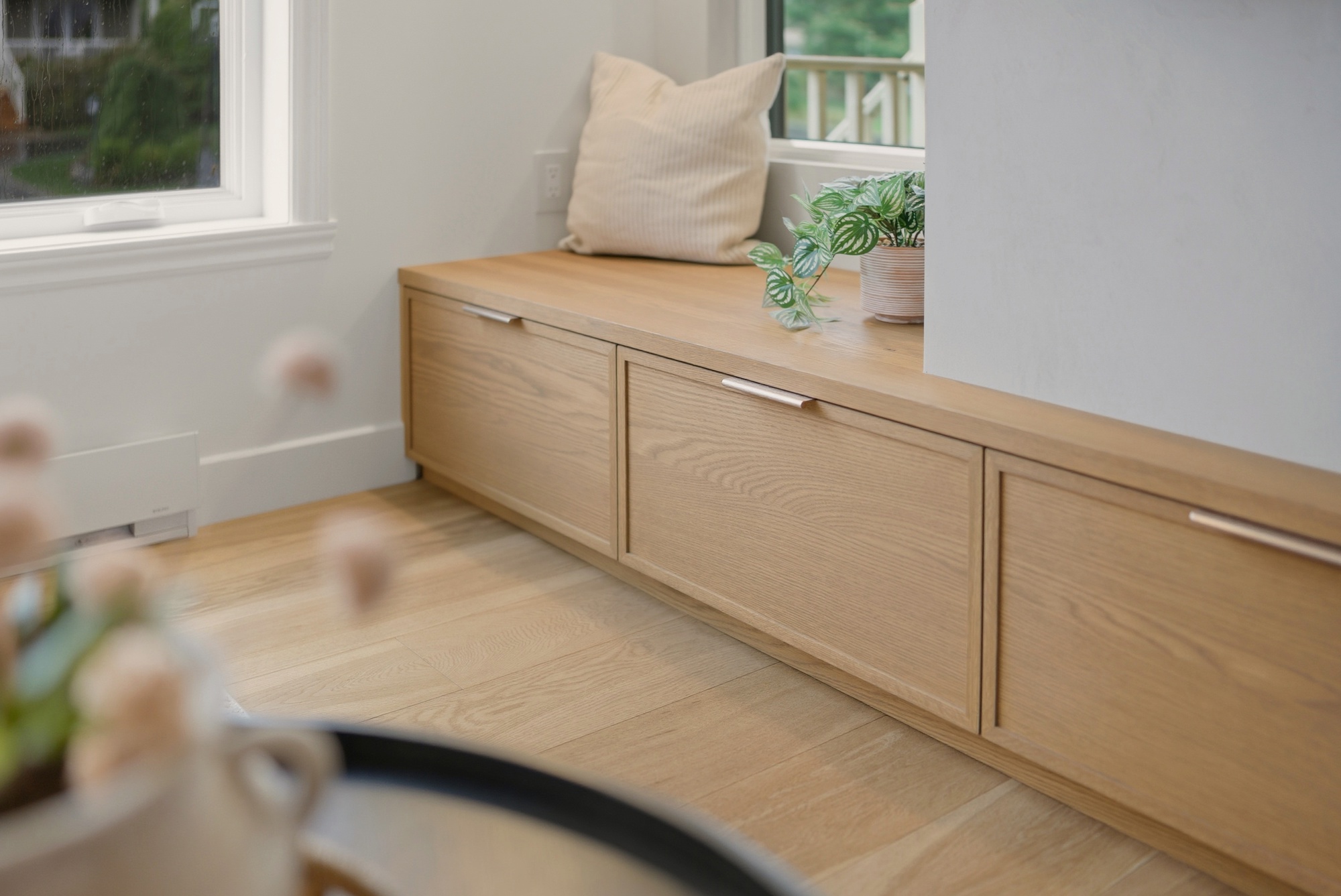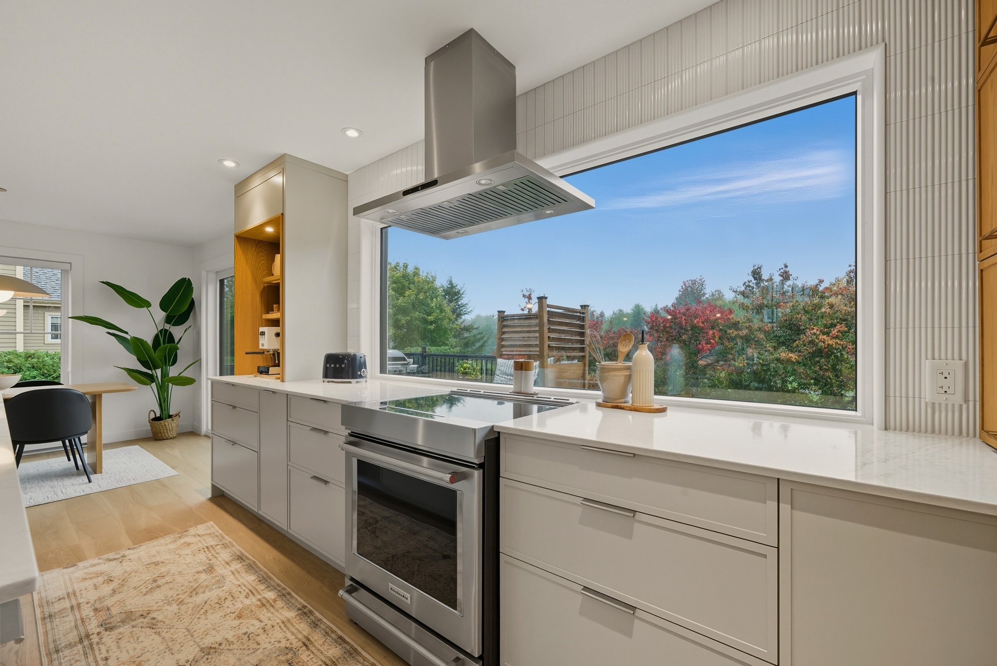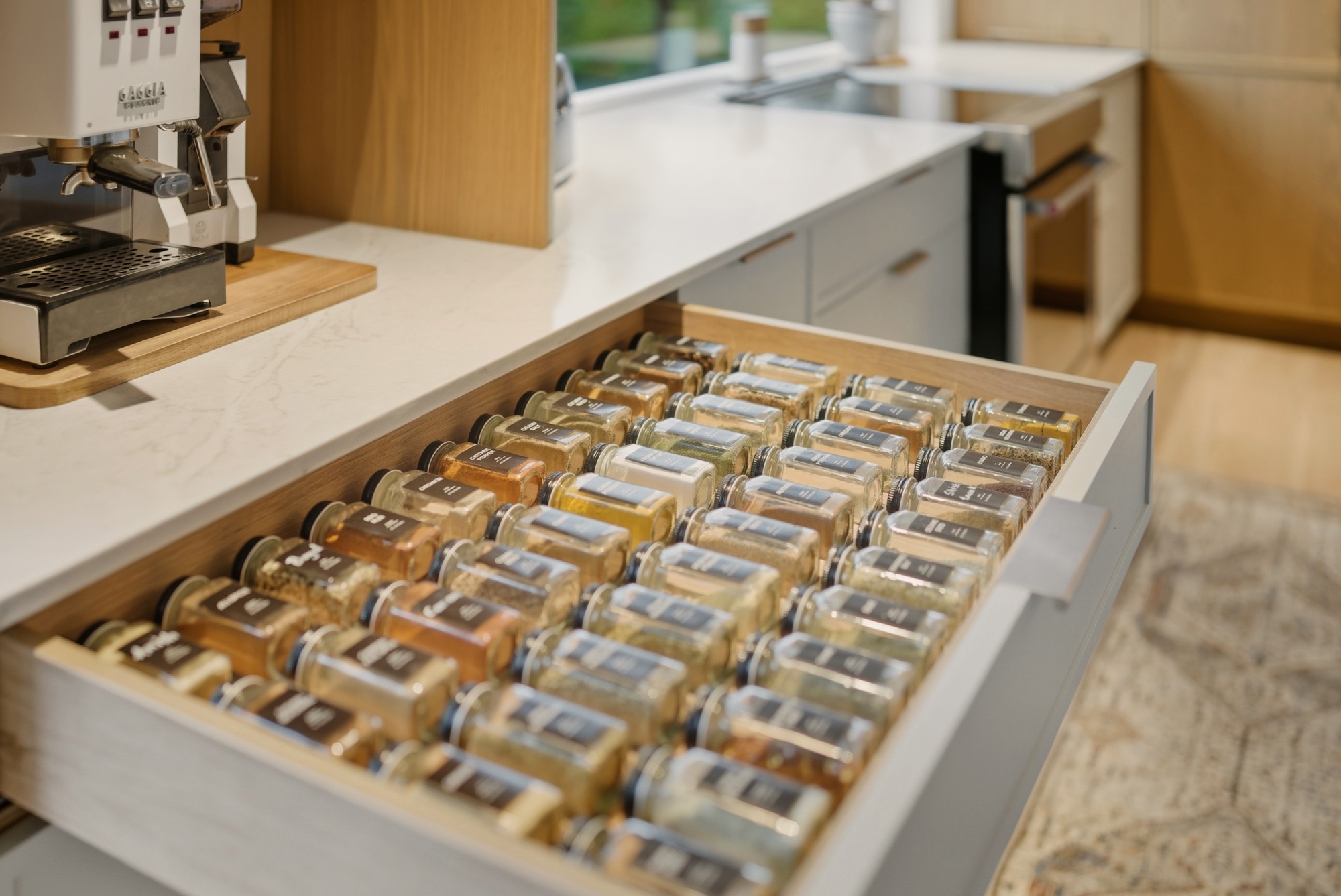 En contraste, le chêne blanc naturel vient réchauffer la composition avec sa texture vivante et son grain délicat, ancrant l’espace dans une matière authentique et intemporelle. Les volumes pleine hauteur structurent la pièce avec précision, tandis que le coin café, intégré comme une alcôve, crée un moment intime — un luxe discret, au quotidien.