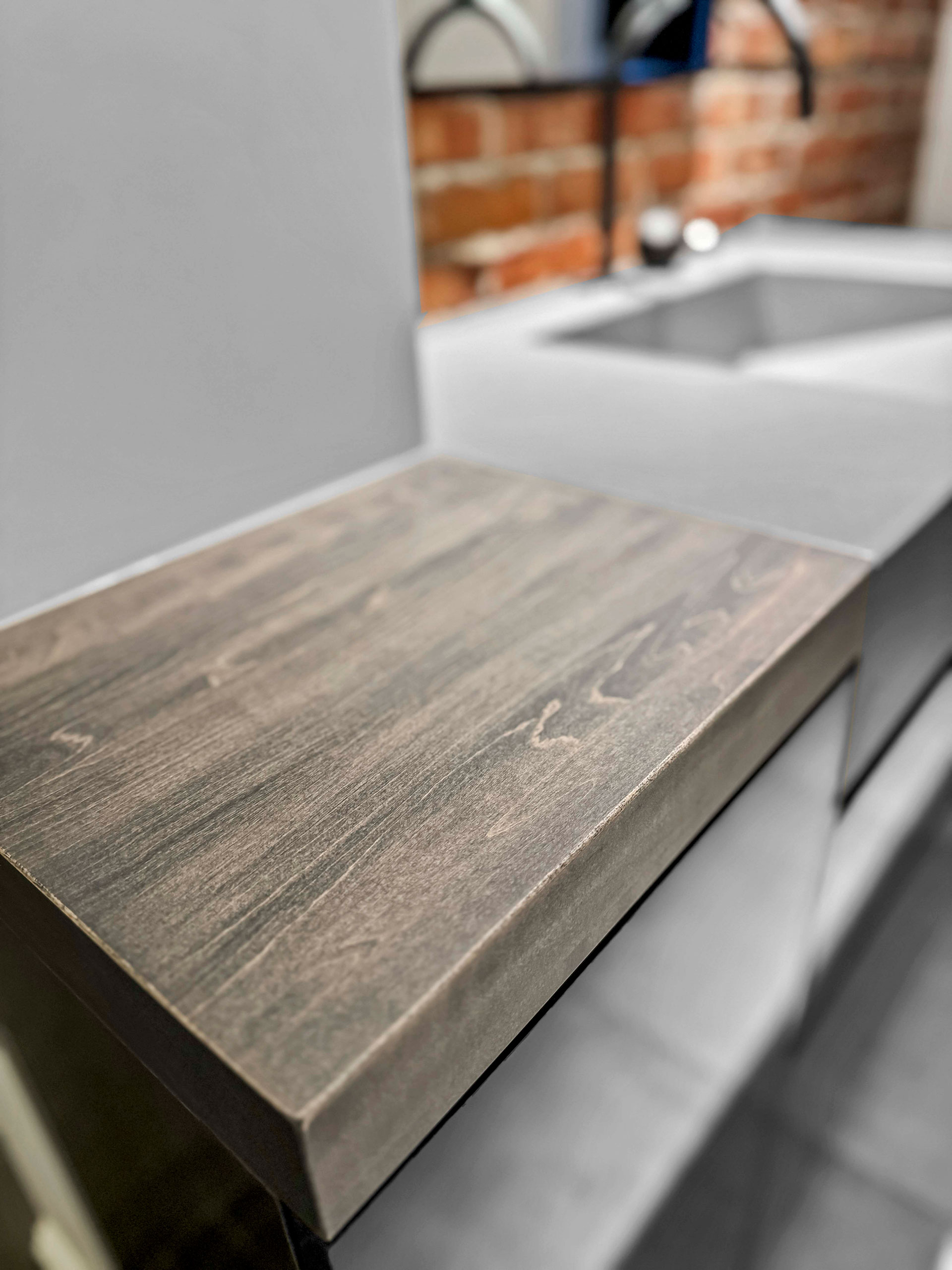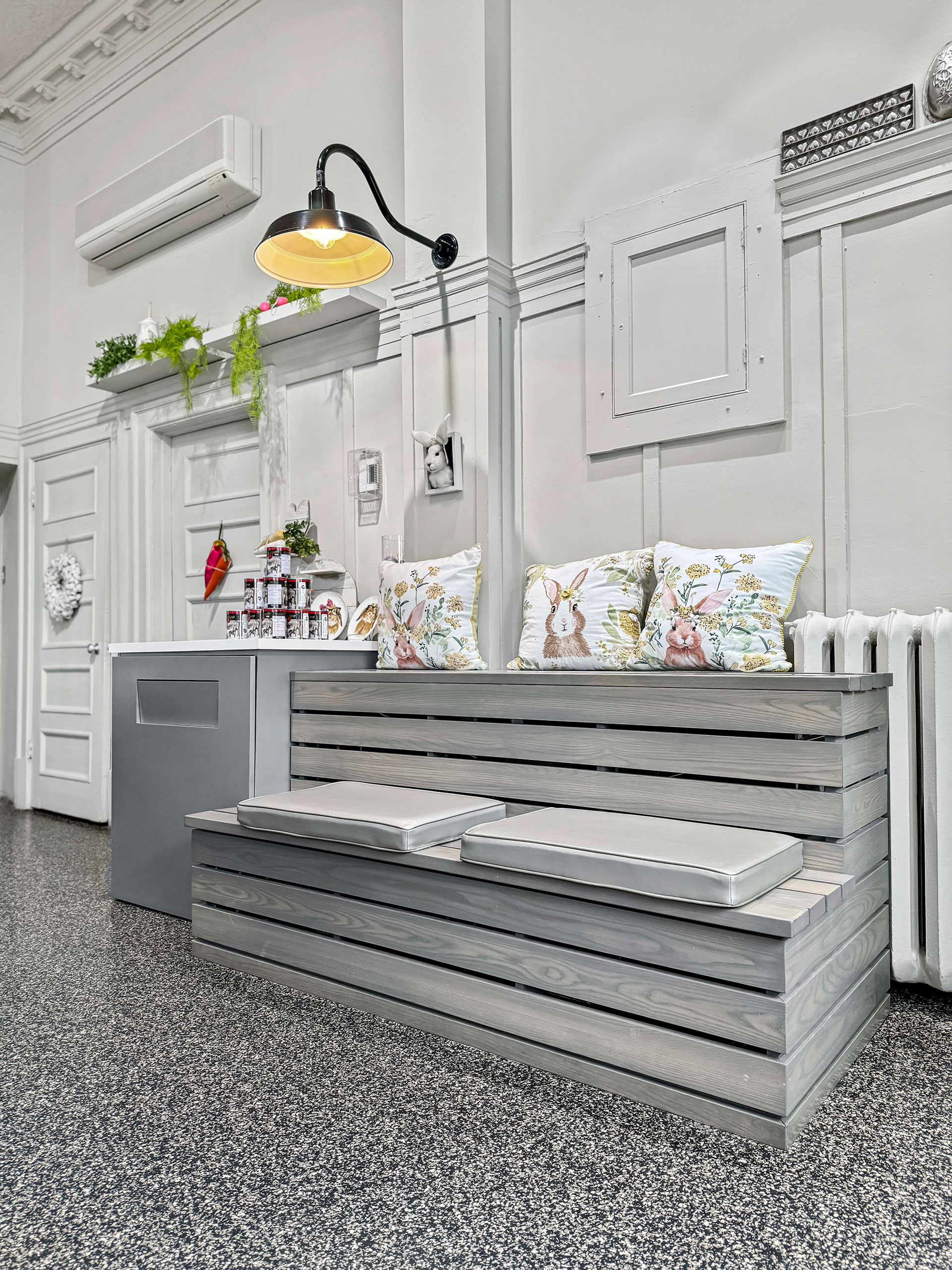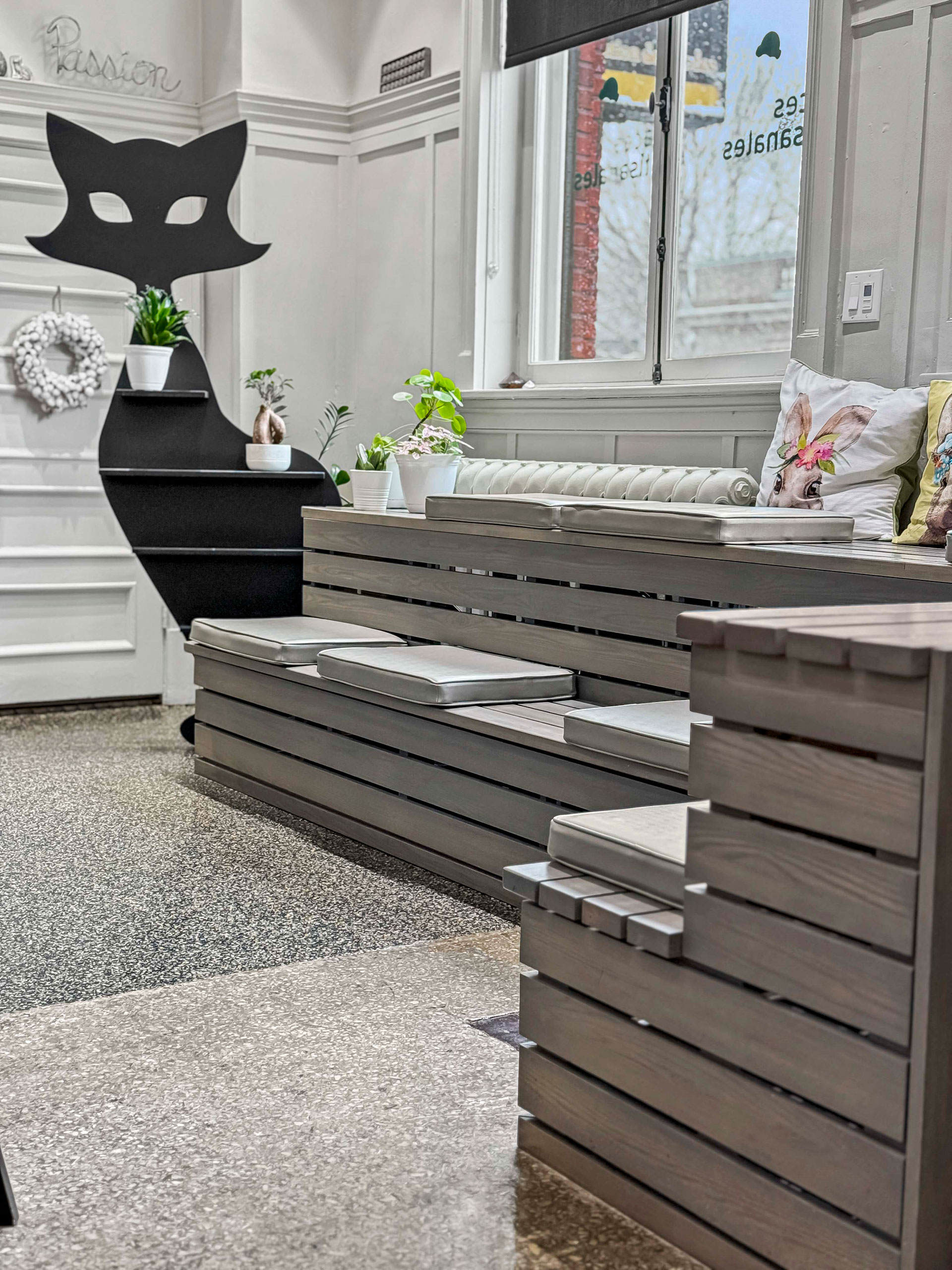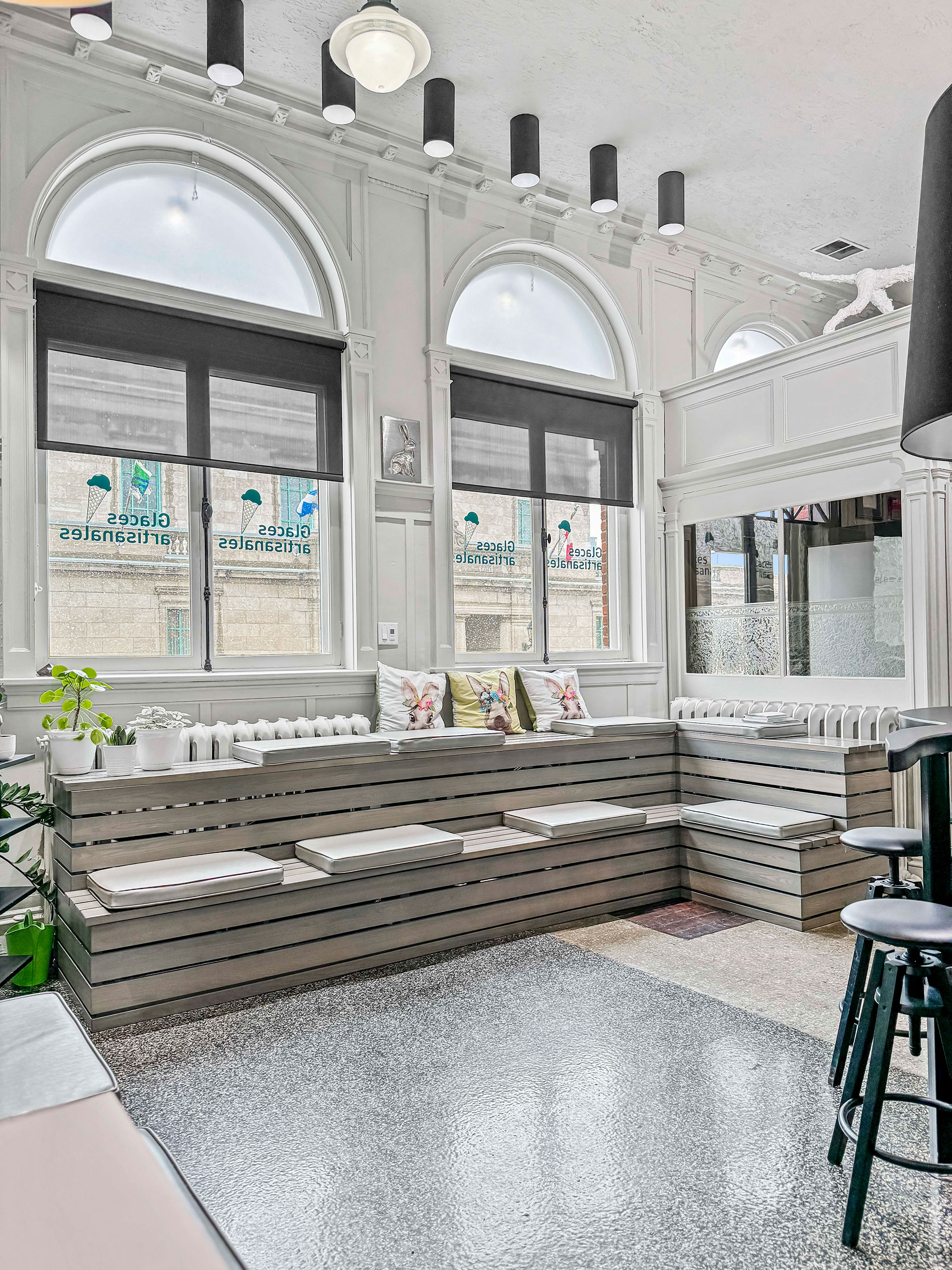 Banquette fabriquée en frêne massif teint et verni pour la Chocolaterie Samson (Trois-Rivières).
