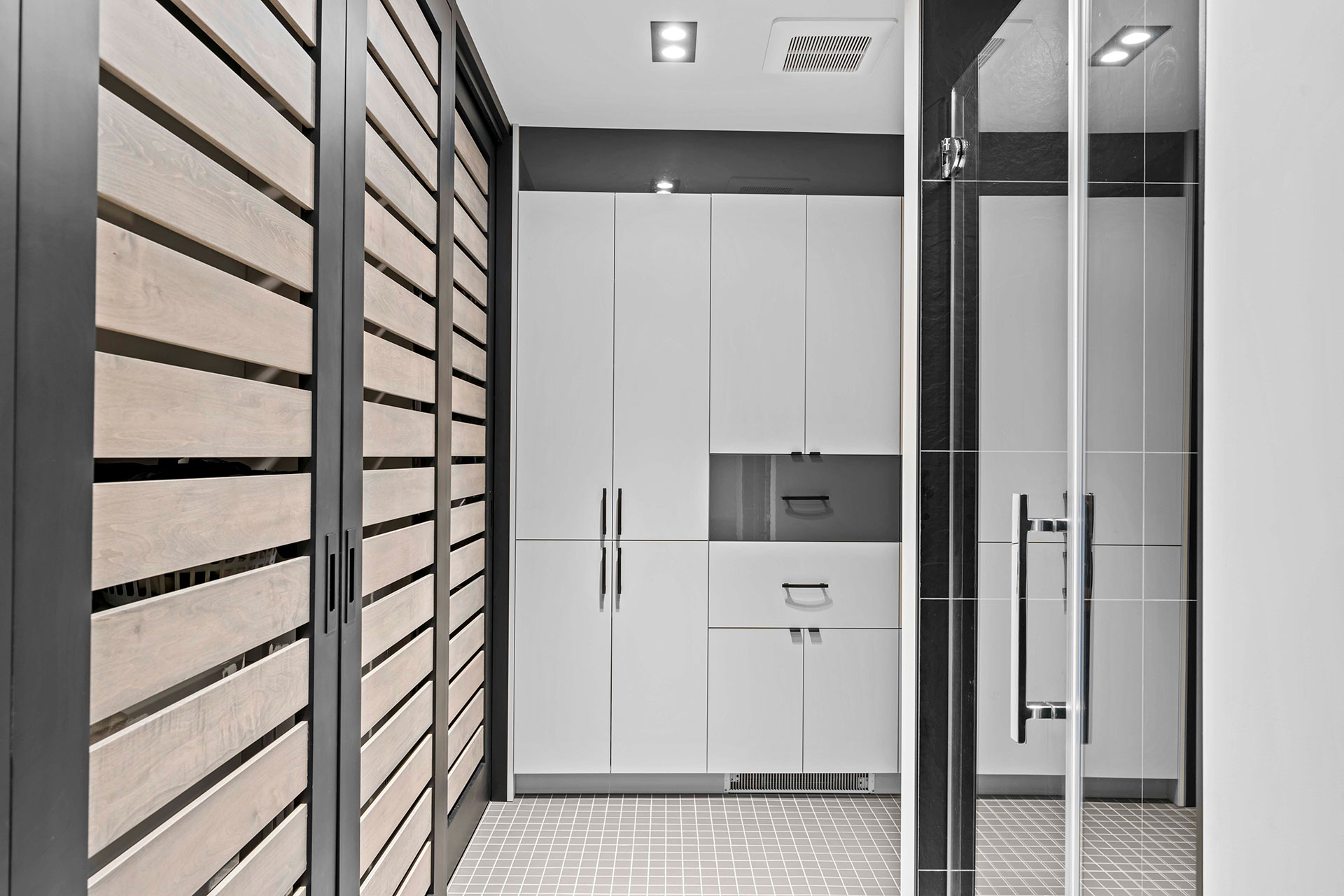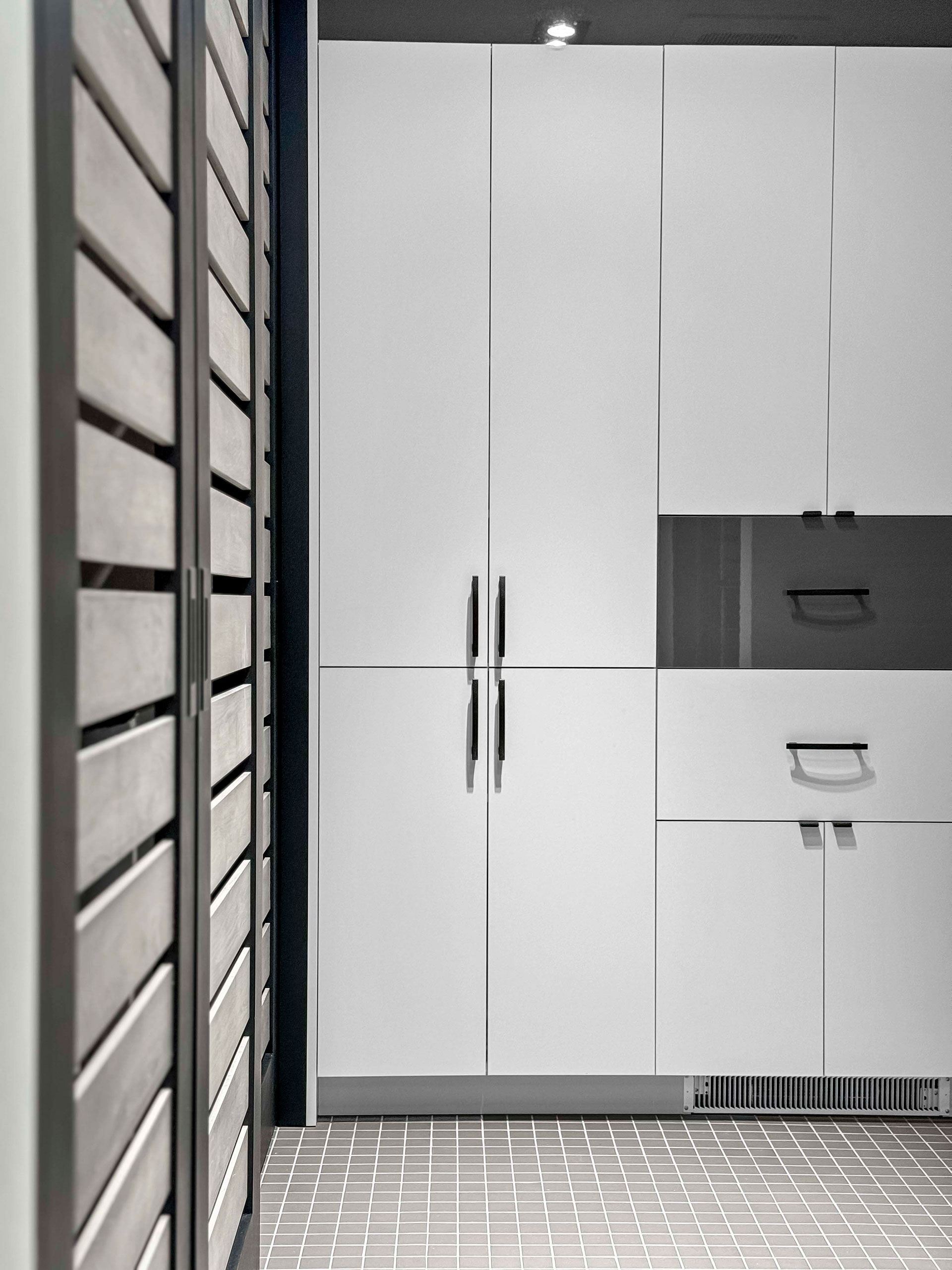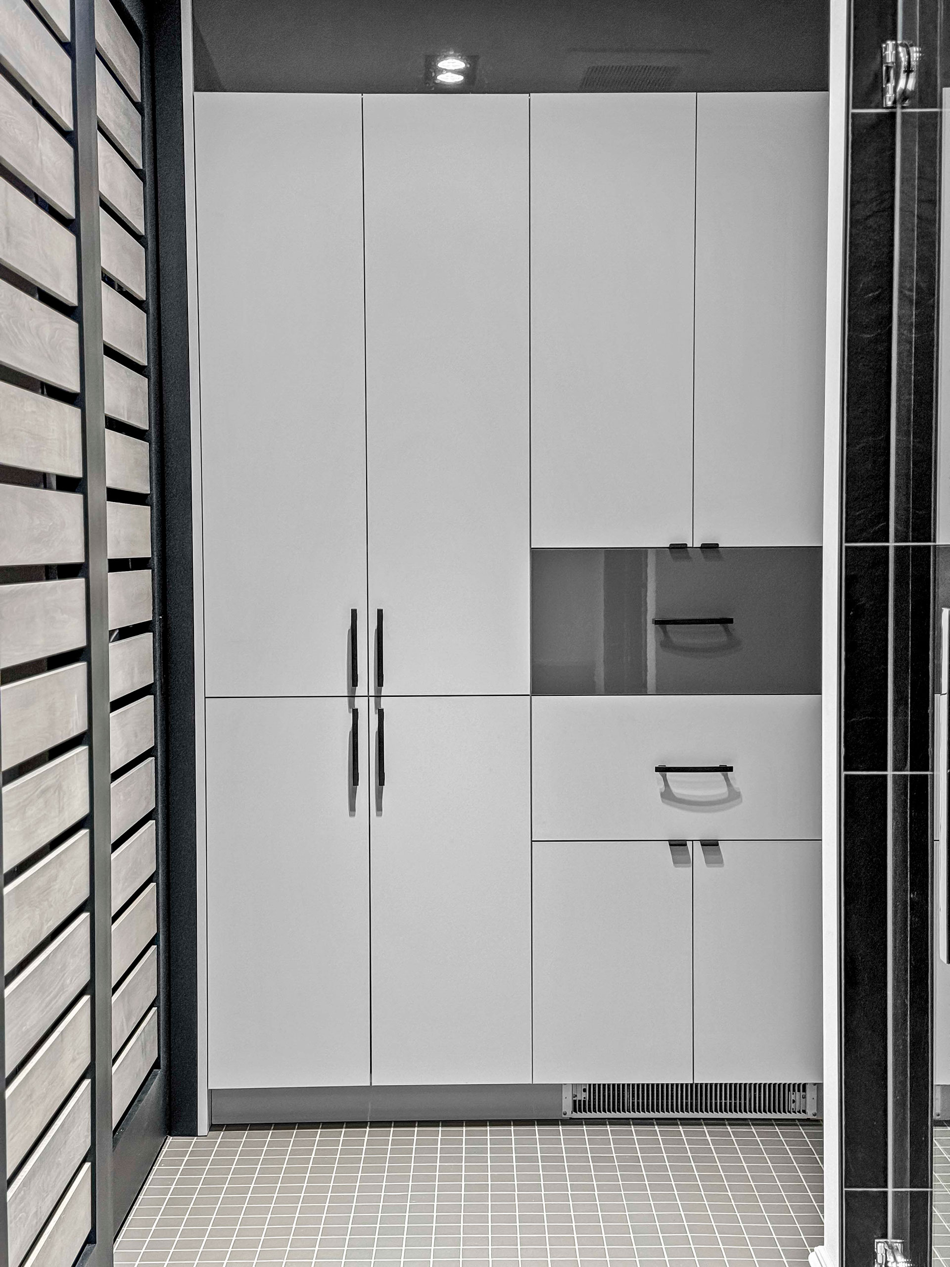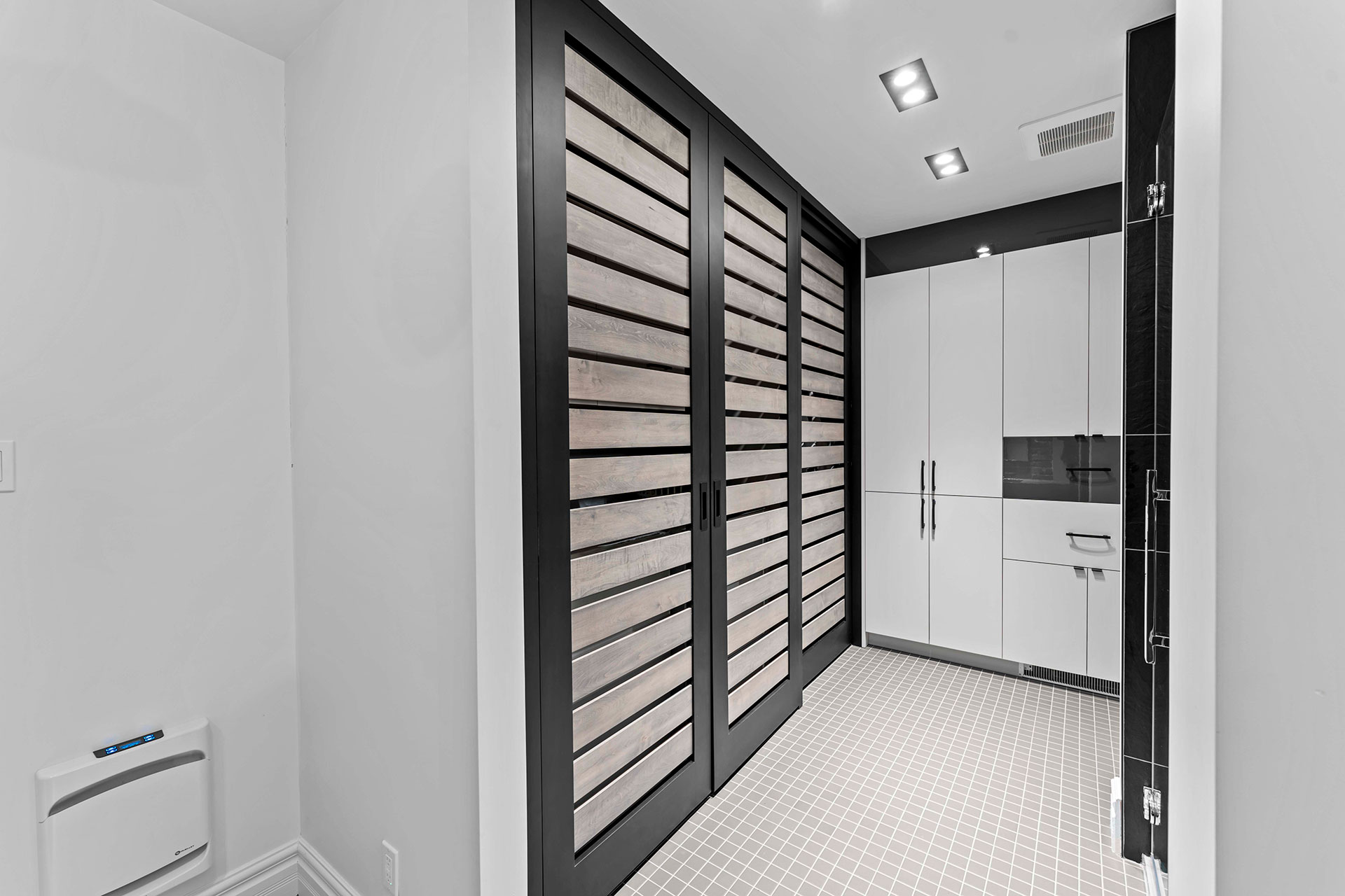 Portes en merisier avec lattes médianes huilées grises à l’aide des produits Livos et cadre teint en noir avec un vernis mat.