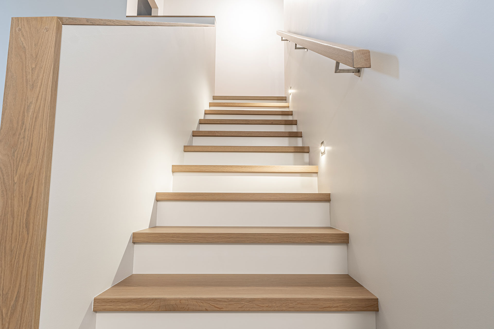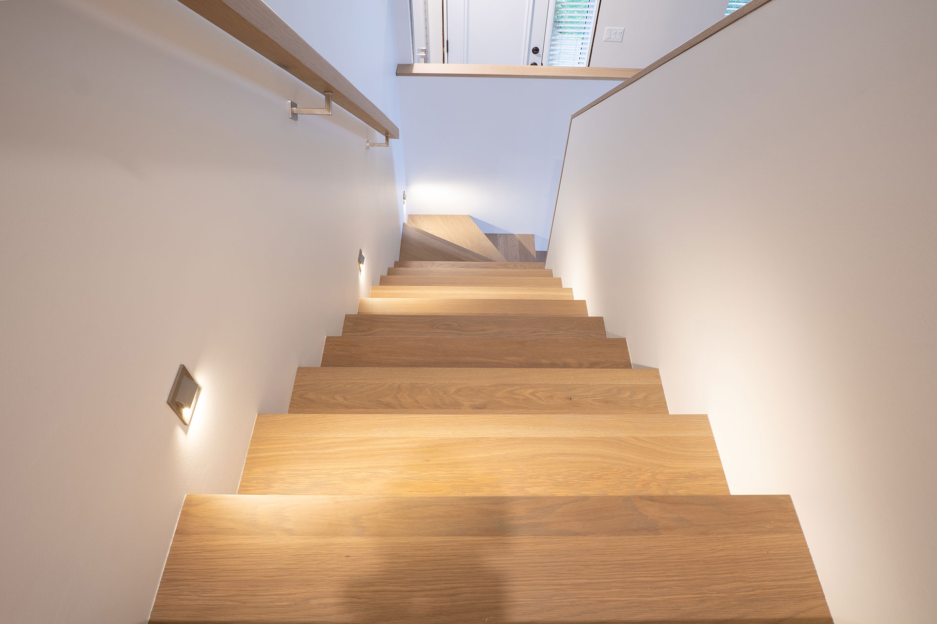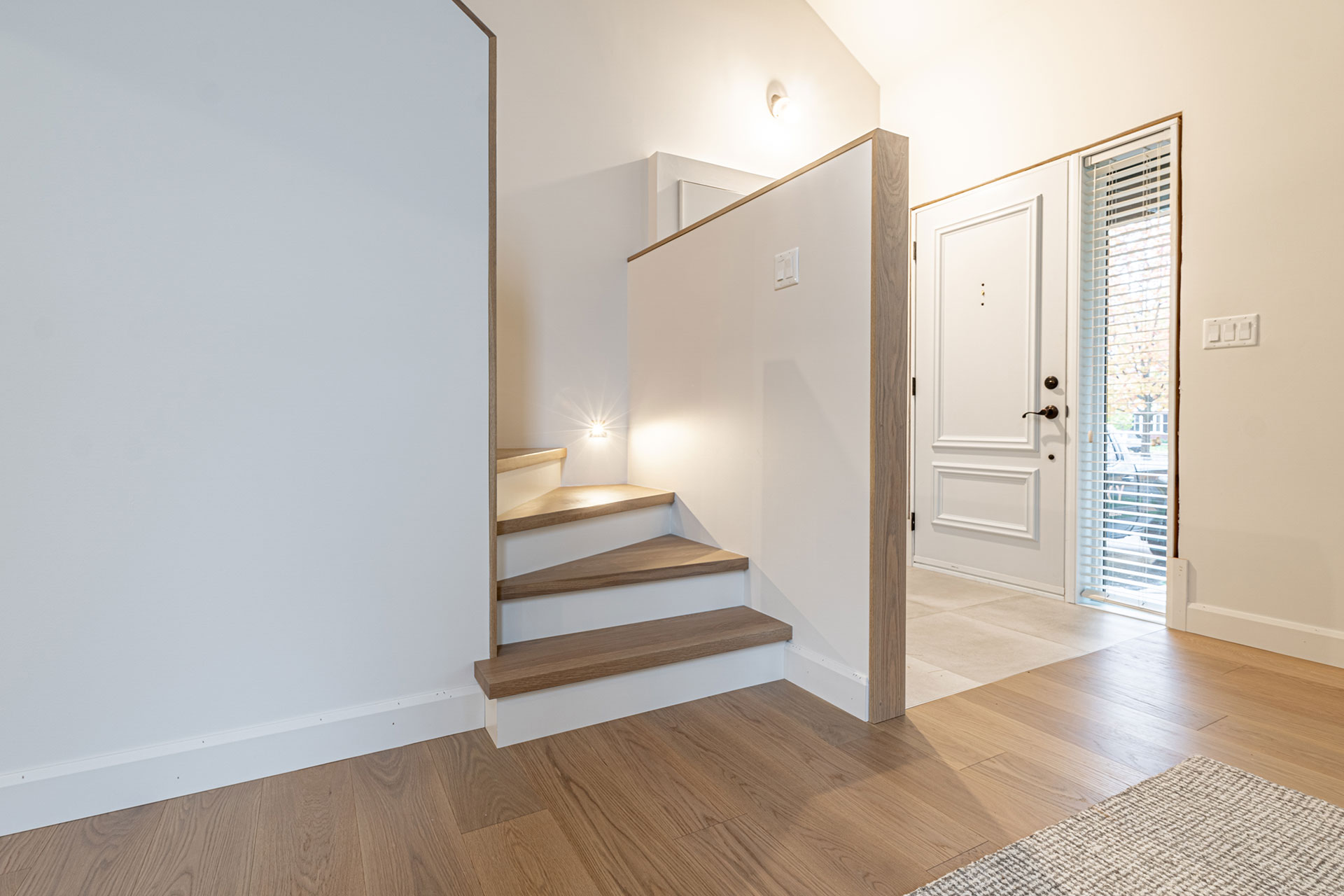 Escalier en merisier massif laqué blanc avec composantes de chêne blanc teint et verni.