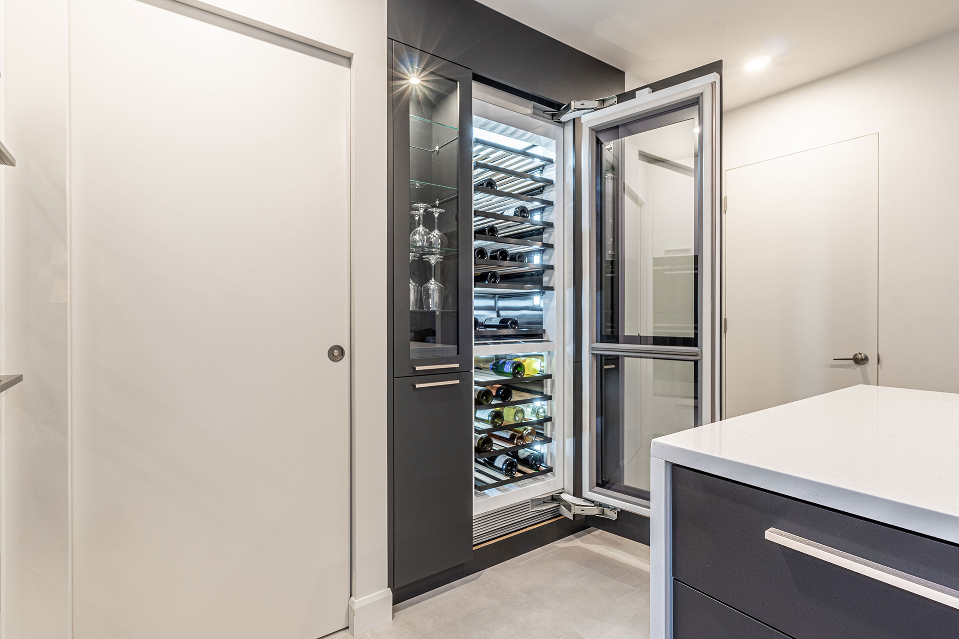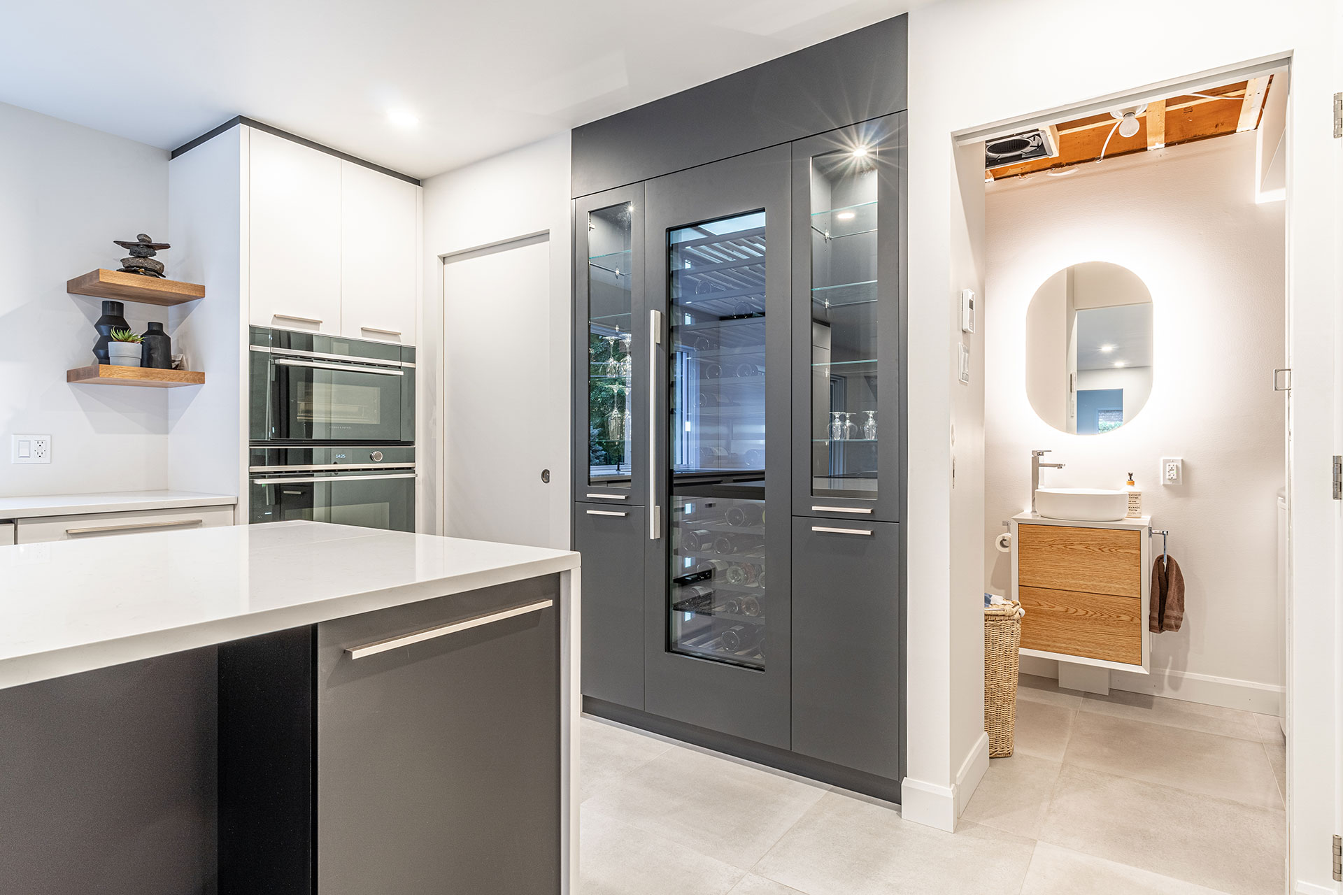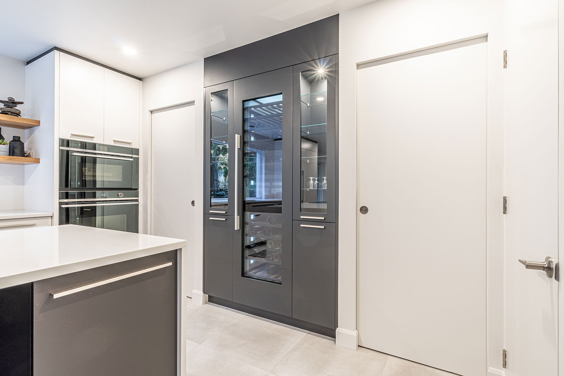 Cuisine en stratifié blanc et noir, avec cellier en MDF laqué noir mat assorti au stratifié.