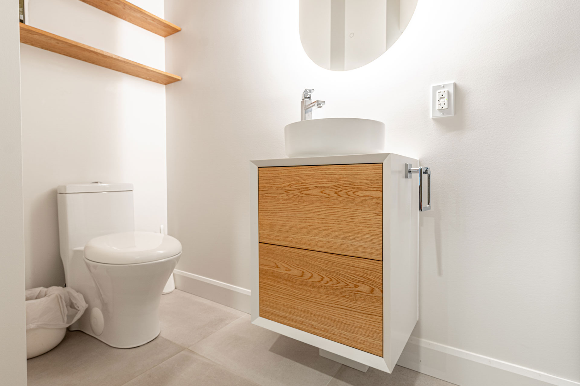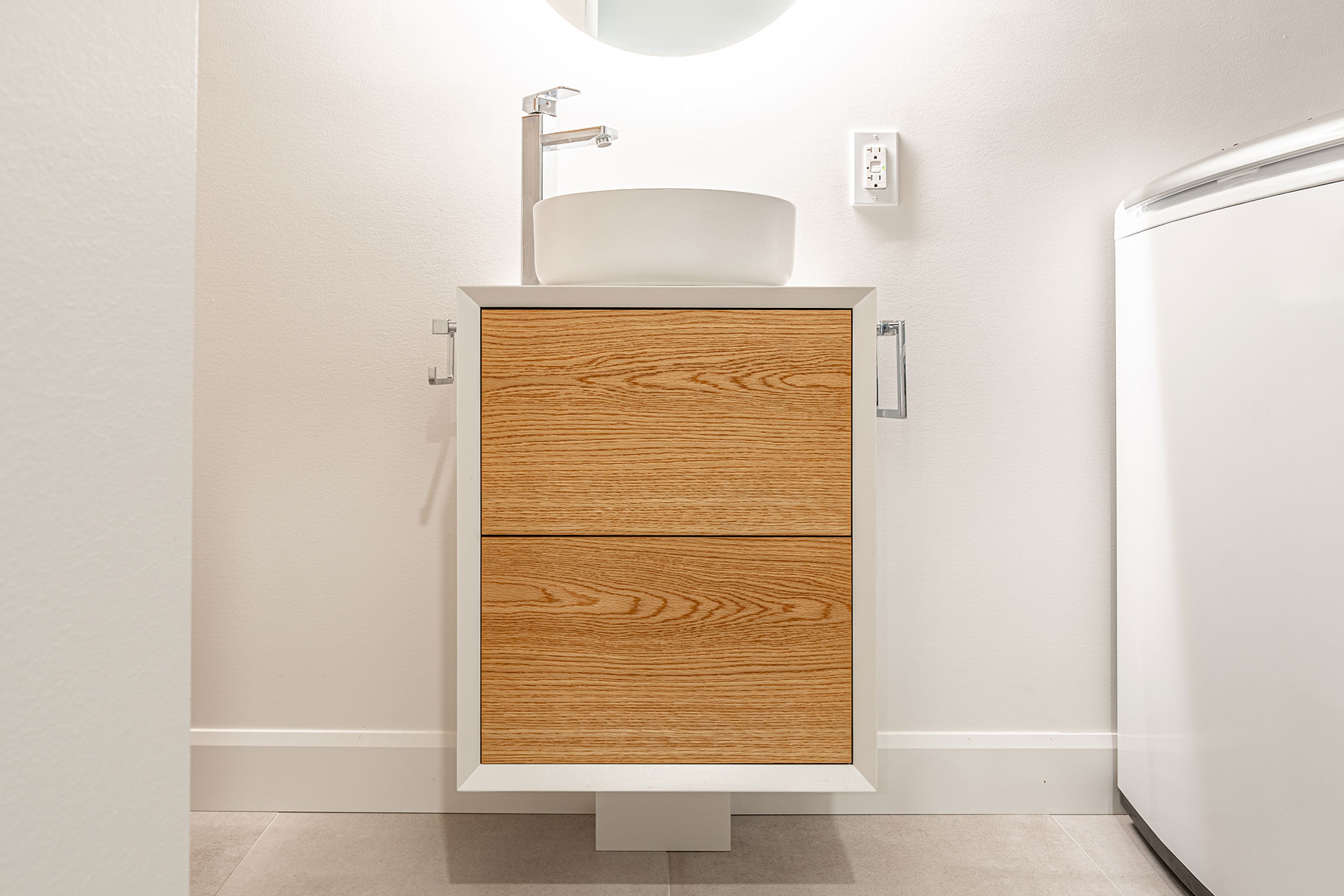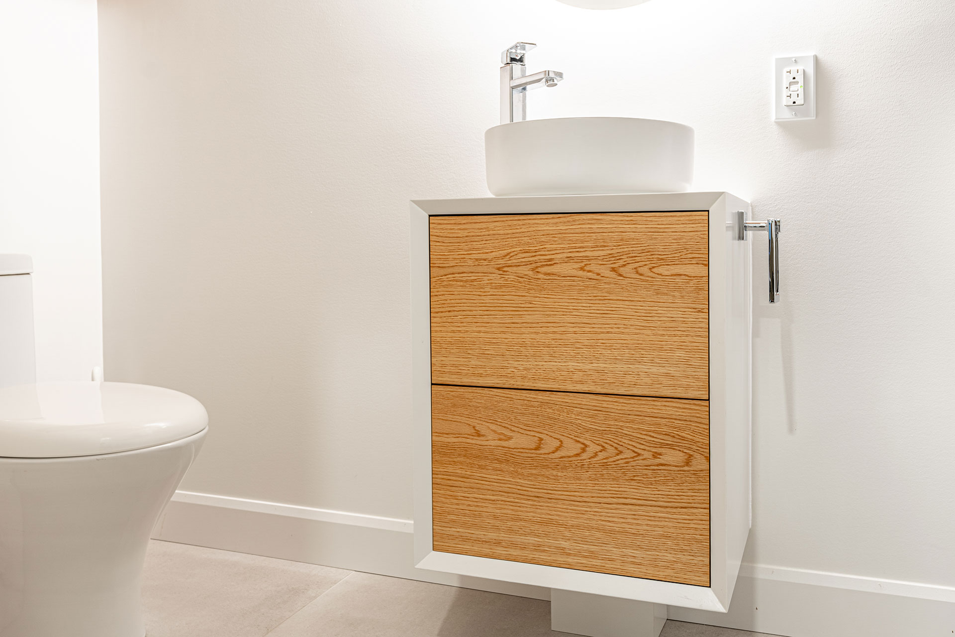 Vanité, rangement et descente de plafond pour salle de bain de style moderne.